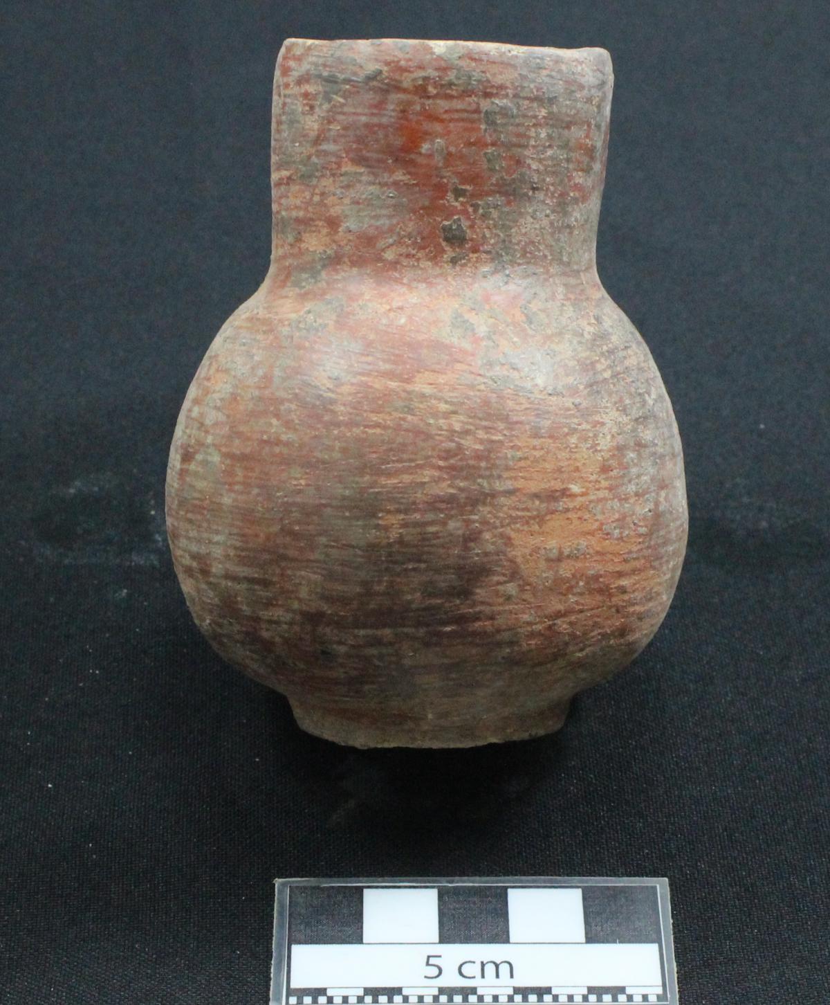 3565 - Jarra globular con base anular, cuello largo y borde recto. Engobe de color rojo en el exterior y engobe de color blanco sobre el cuello. Banda de color morado sobre el cuello.