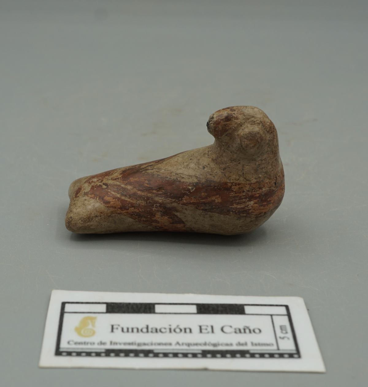 Silbato en forma de ave. Presenta engobe blanco y decoración en rojo y negro.