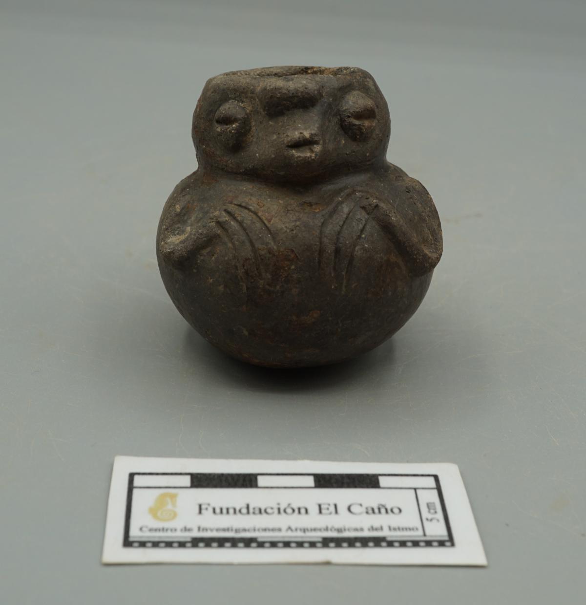Vasija zoomorfa en forma de ave. La superficie es negra producto de haber sido cocida en un ambiente reducido.