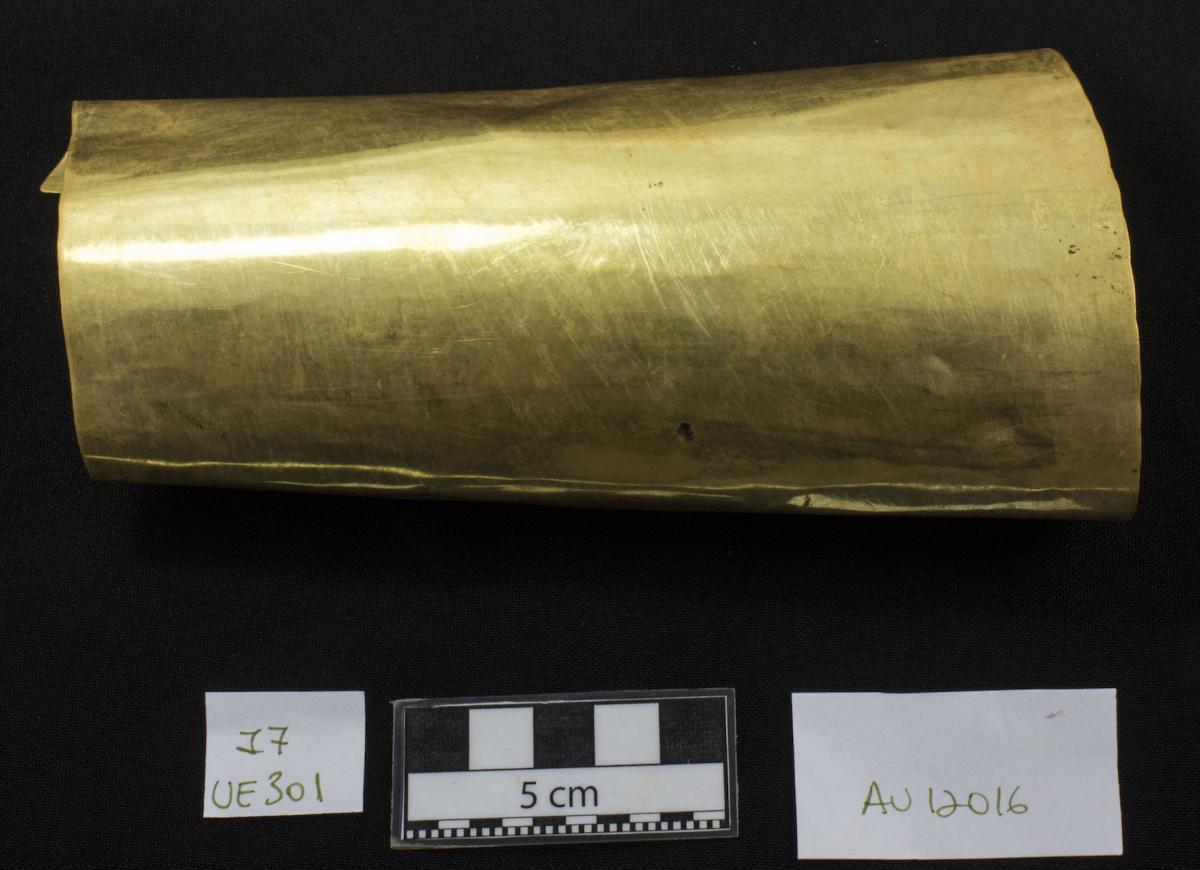 387 - Pectoral de oro martillado repujado con la representación frontal del rostro de un ser sobrenatural con rasgos de un anciano que formaba parte del ajuar del Individuo 20, un infante, de la ...