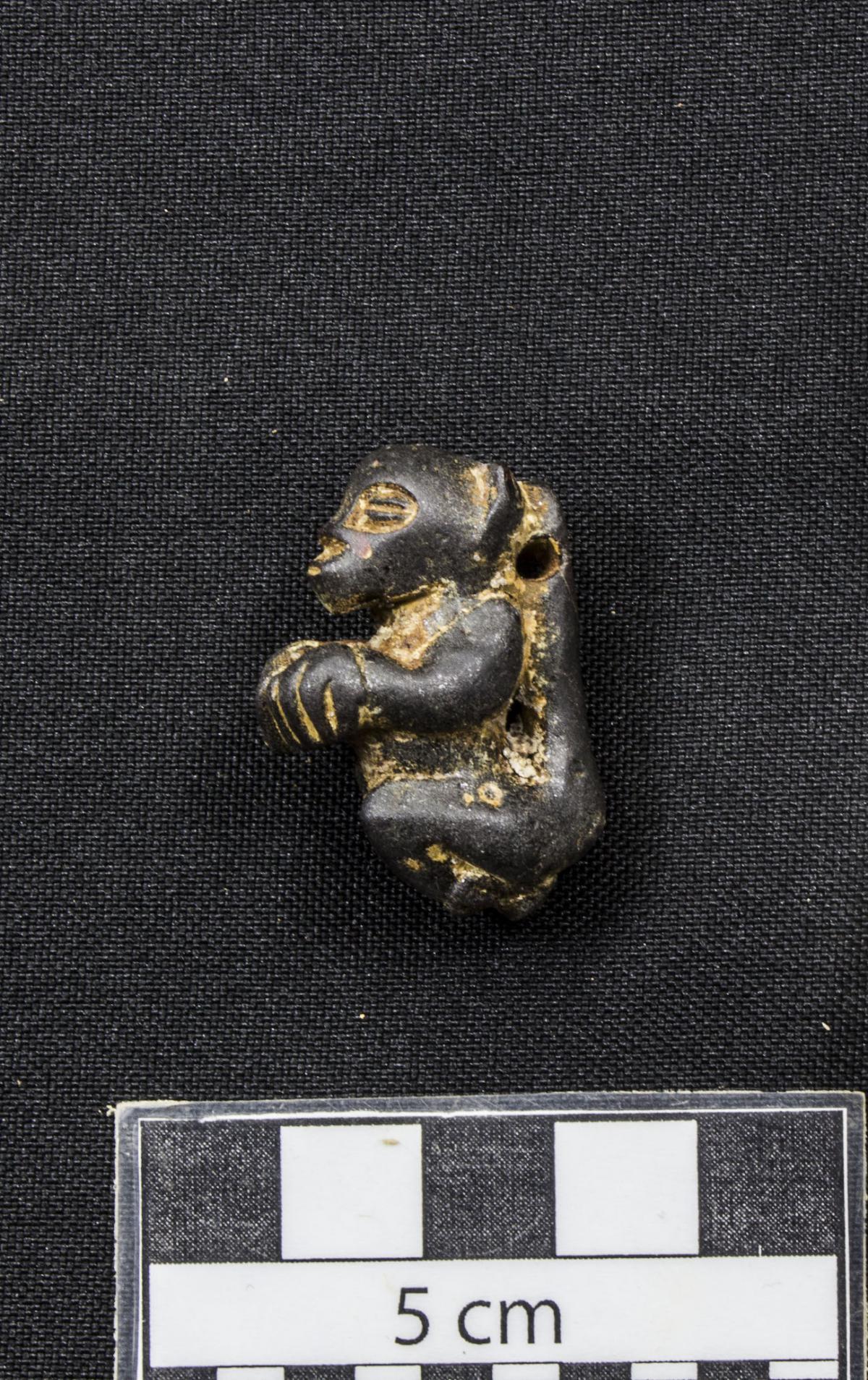 374 - Pendiente zoomorfo representando a un pelícano con la cabeza girada y apoyada sobre el lomo. Presenta la boca dentada y dos orificios para ser colgada. Formaba parte de un collar de canino...