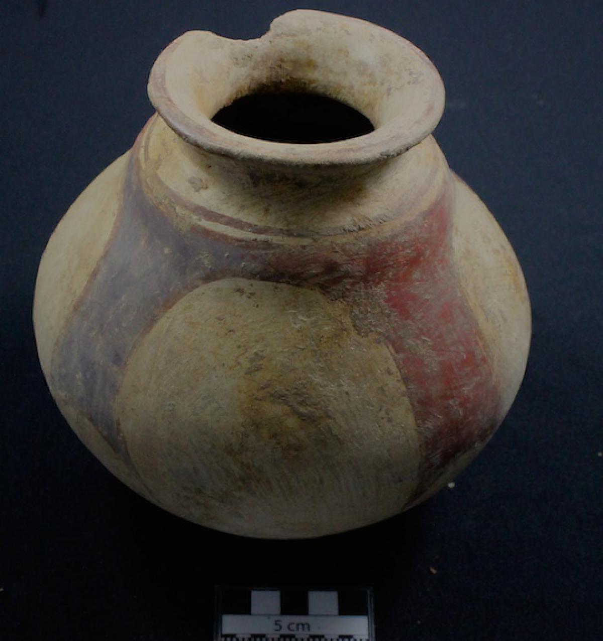 3565 - Jarra globular con base anular, cuello largo y borde recto. Engobe de color rojo en el exterior y engobe de color blanco sobre el cuello. Banda de color morado sobre el cuello.