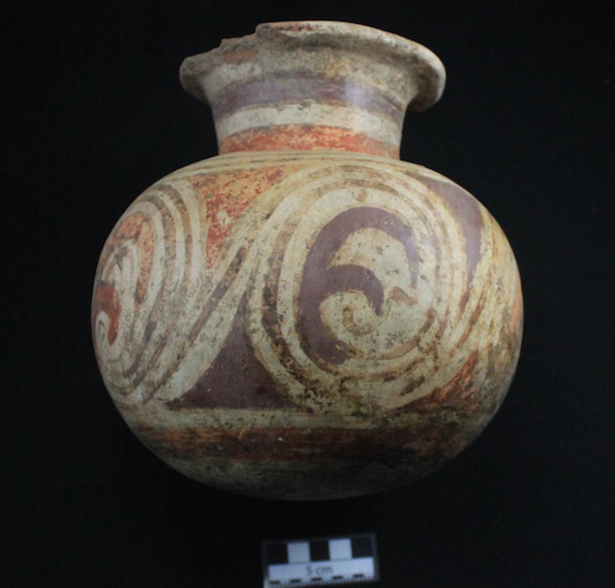 396 - Jarra polícroma globular de cuello largo. Decoración geométrica de espiral continua "yc" a modo de friso sobre el cuello y a modo de bandas alternas de color en zigzag sobre el cuerpo.