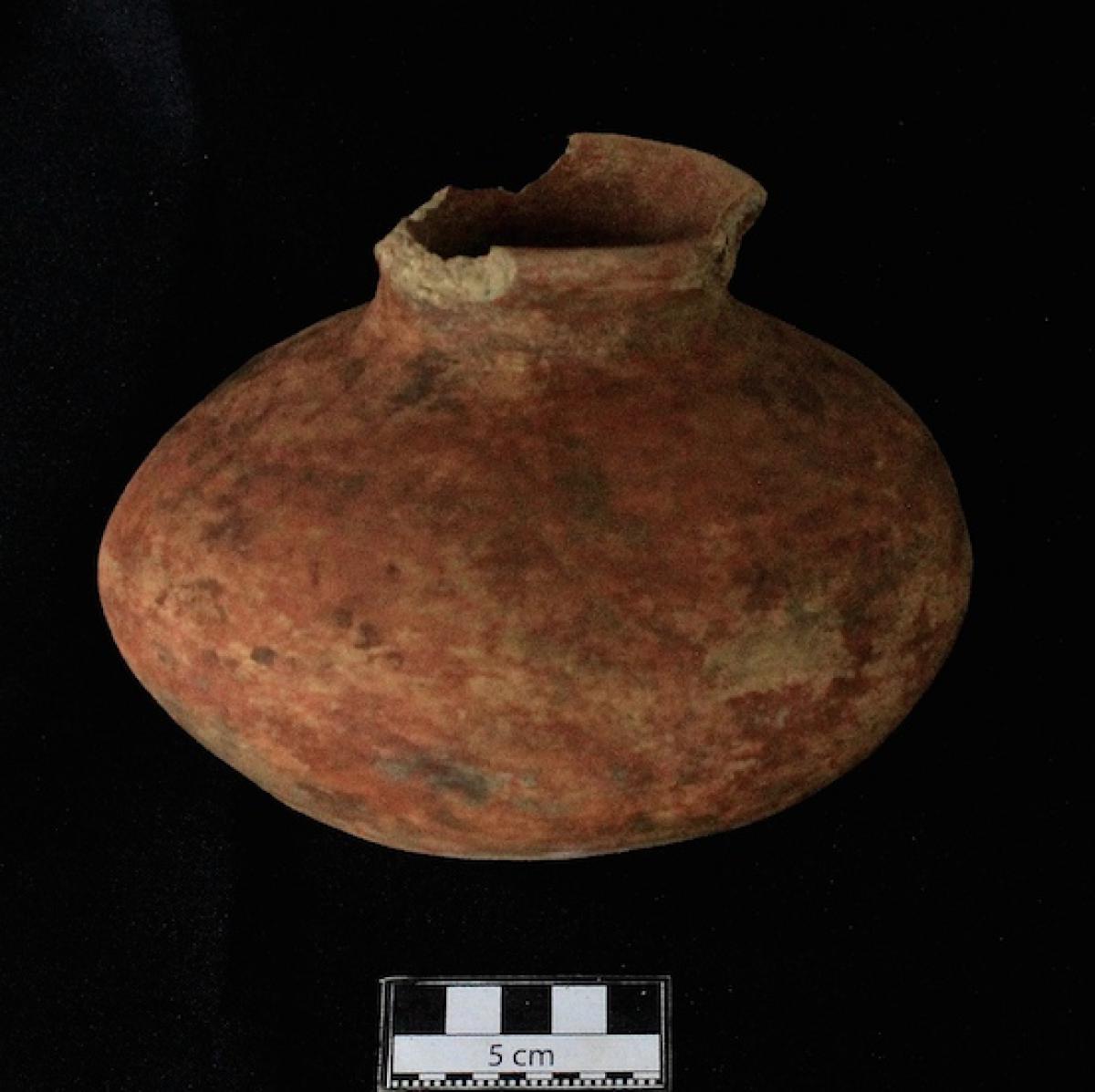 Información del recurso:  Vasija globular perteneciente a la vajilla roja.
