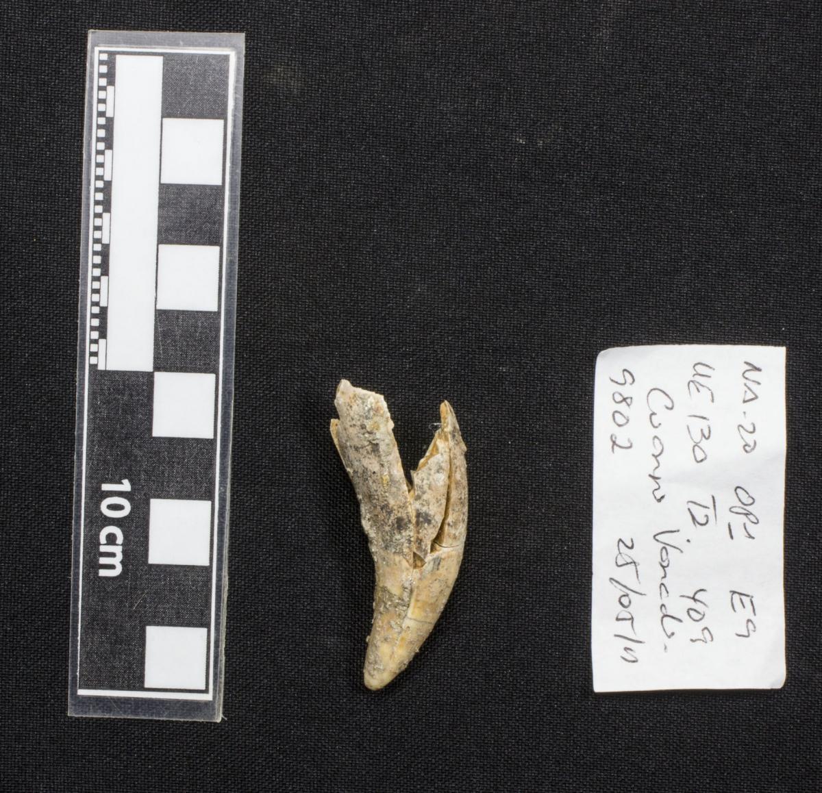 3592 - Canino de perro perforado. Aunque se encuentra fragmentado, se conservan sus partes.