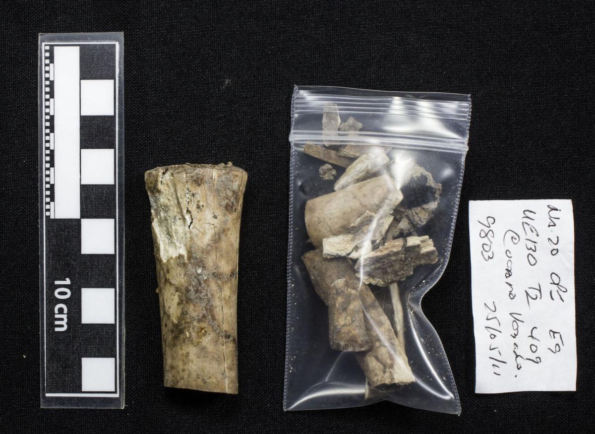 381 - T6-UE125 (a , (llamado en el año 2013, unidad UE167).Entierro de la tumba T6. Depósito de huesos humanos en posición primaria localizado a 3,48 m de profundidad. Es un entierro múltiple...