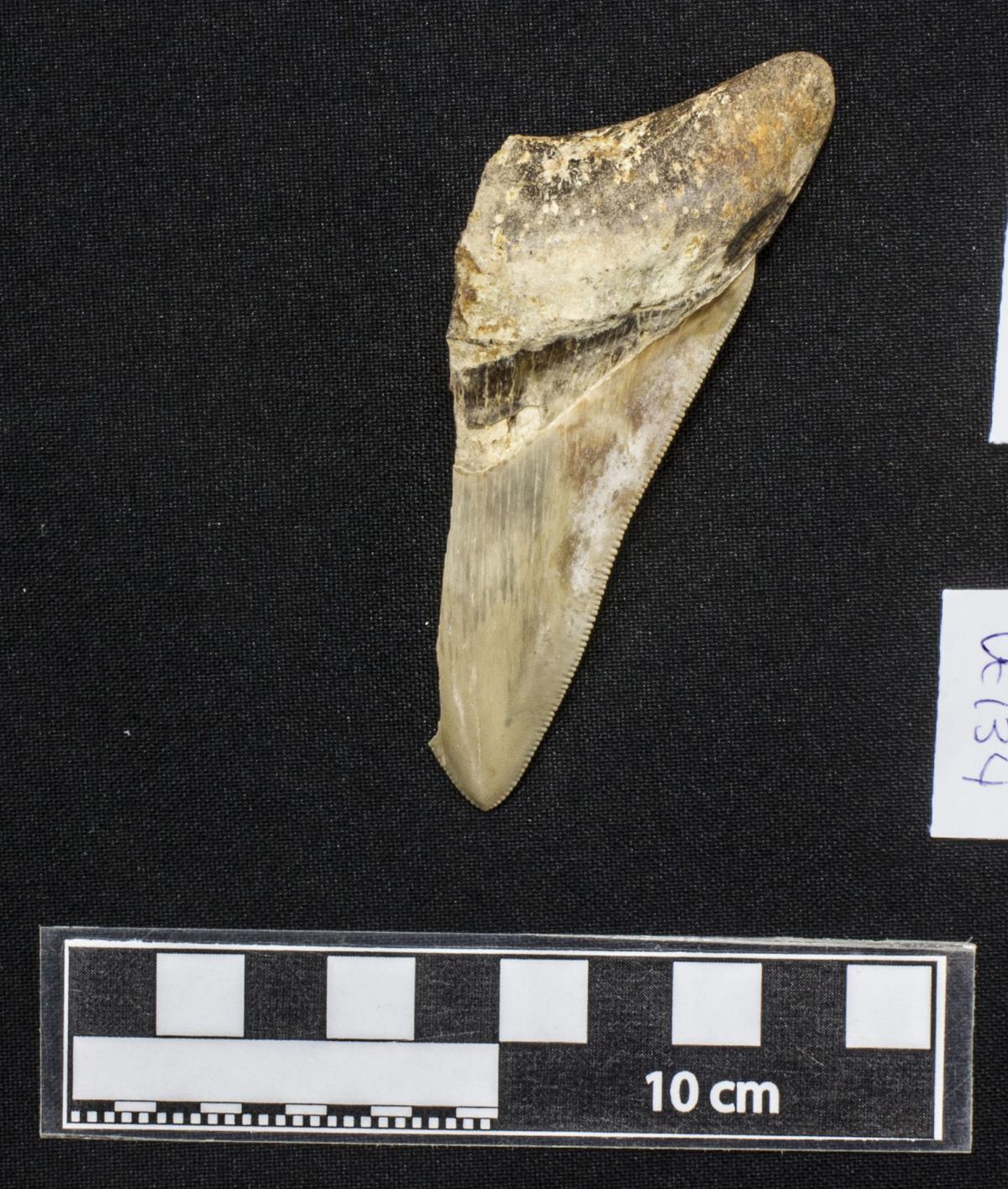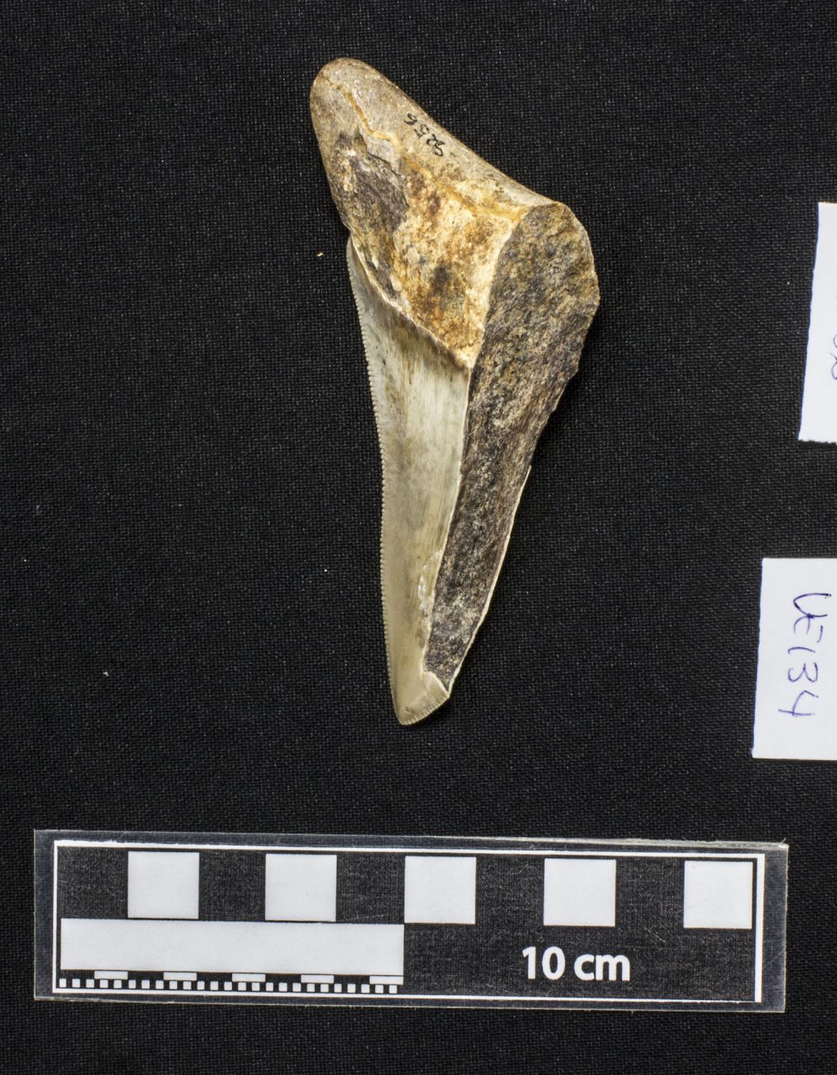 3571 - Diente perforado de tiburón. La perforación indica que pudo haber formado parte de un artefacto ornamental.