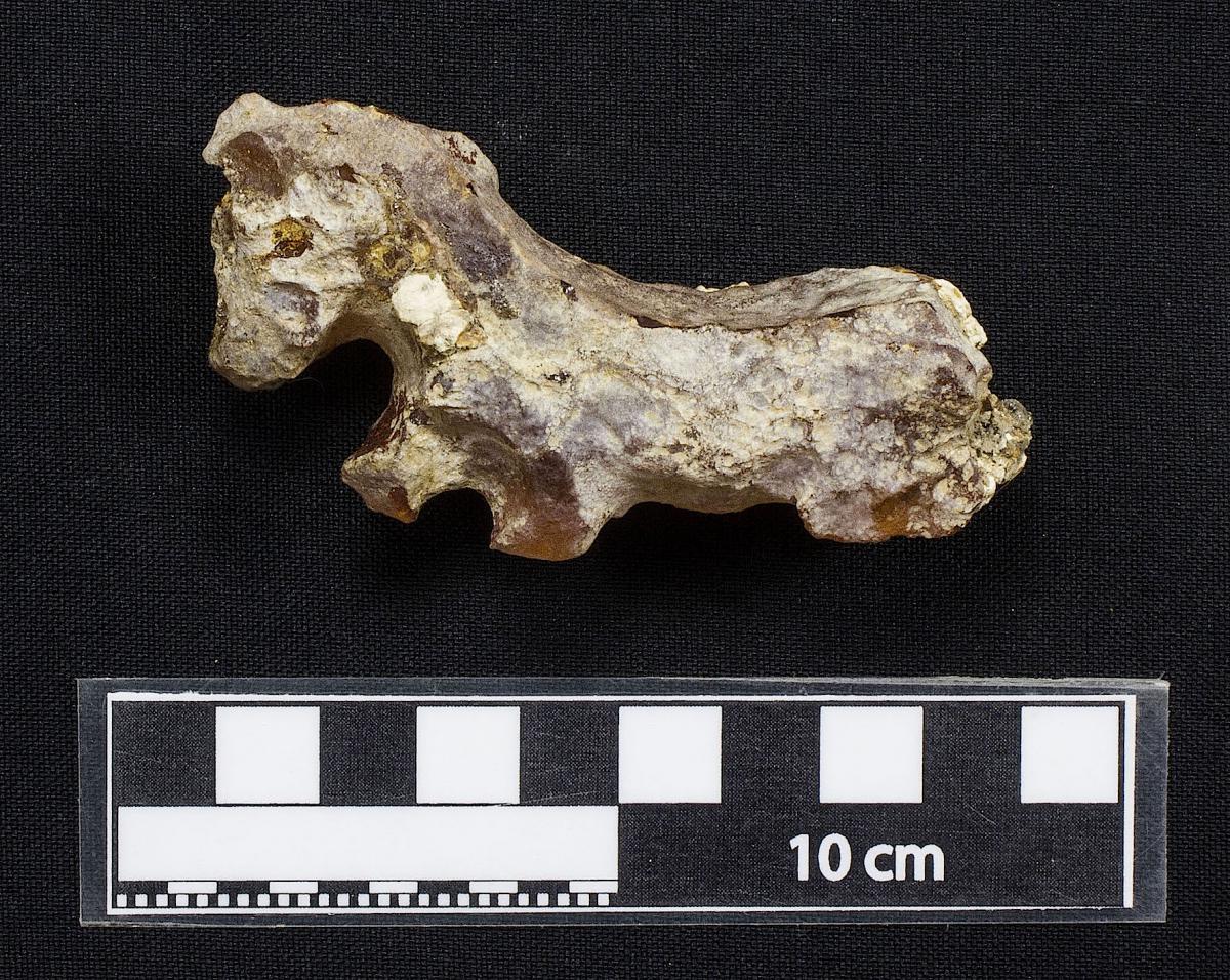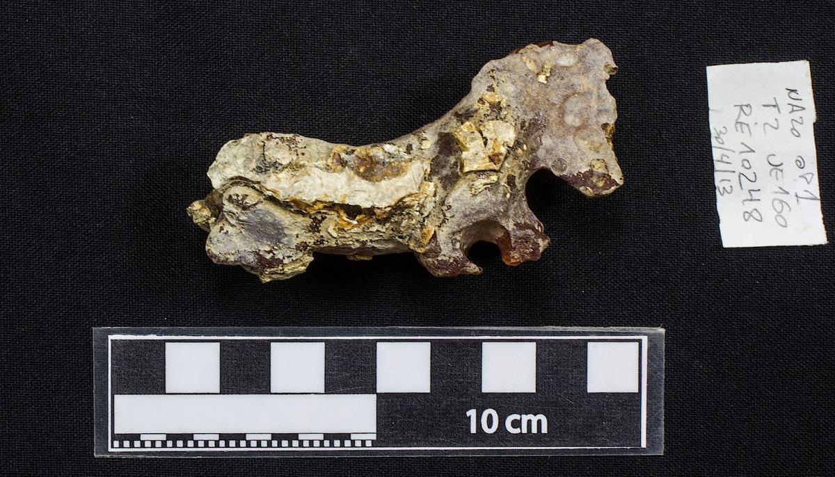 3606 - Hueso metapodiano trabajado de felino, parcialmente restaurado.