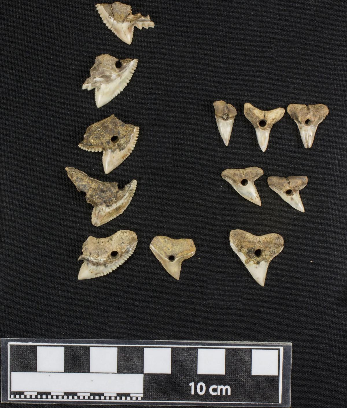 Información del recurso:  Dientes perforados de tres especies de tiburón diferentes. Galeocerdo cubieri -columna de la izquierda, Carcharhinus leucas -los tres dientes en la parte inferior de la columna de la derecha- y Carcharhinus limbatus a cuya especie pertenecen los tres dientes en la parte superior de esa misma columna.