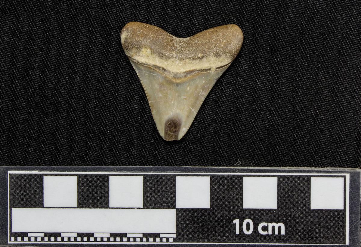 3571 - Diente perforado de tiburón. La perforación indica que pudo haber formado parte de un artefacto ornamental.