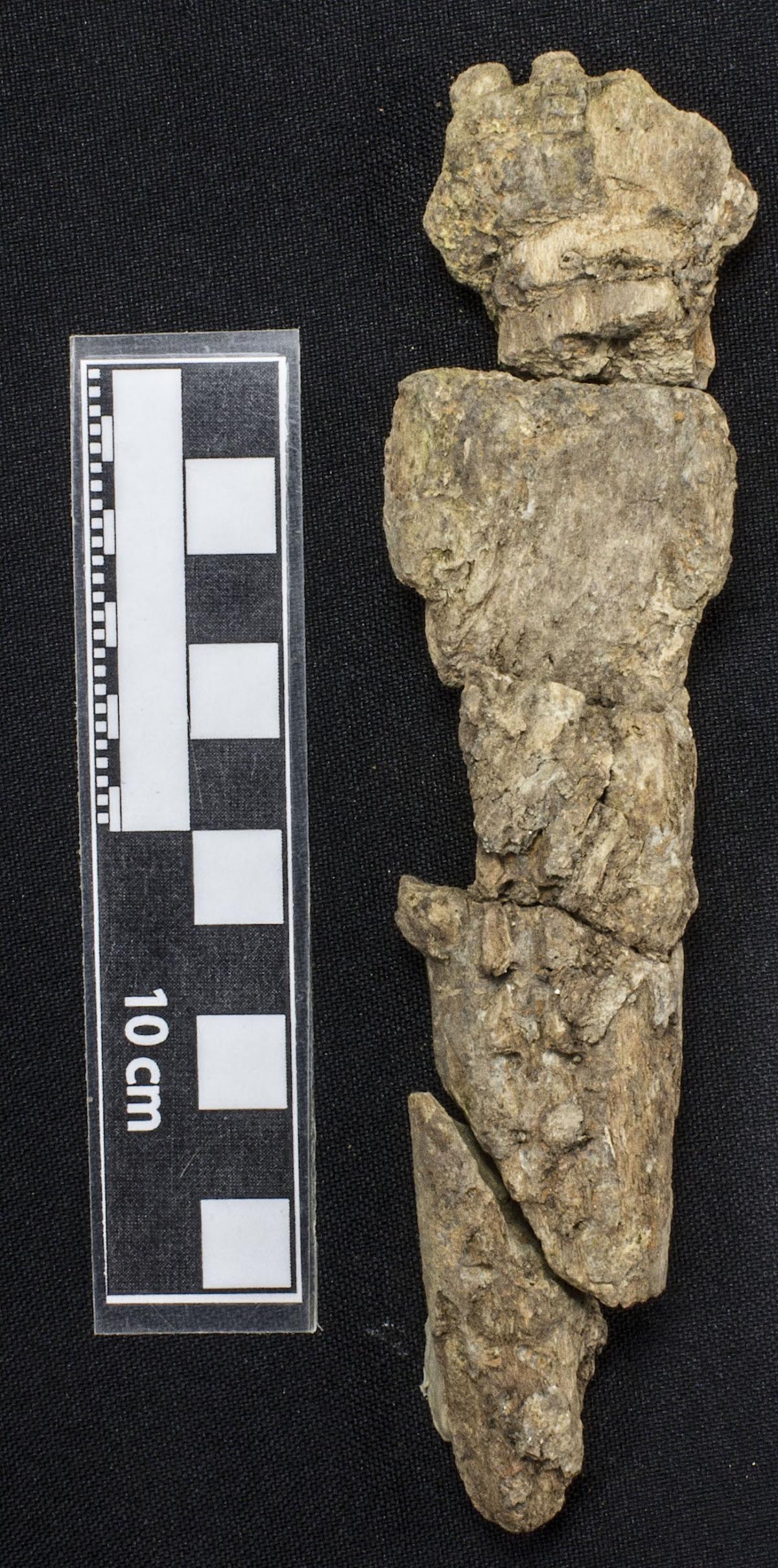 Información del recurso:  Costilla de manatí tallada en forma de ser mítico con cabeza de gran boca llena de dientes, crestas o tocado de plumas, garras y larga cola.