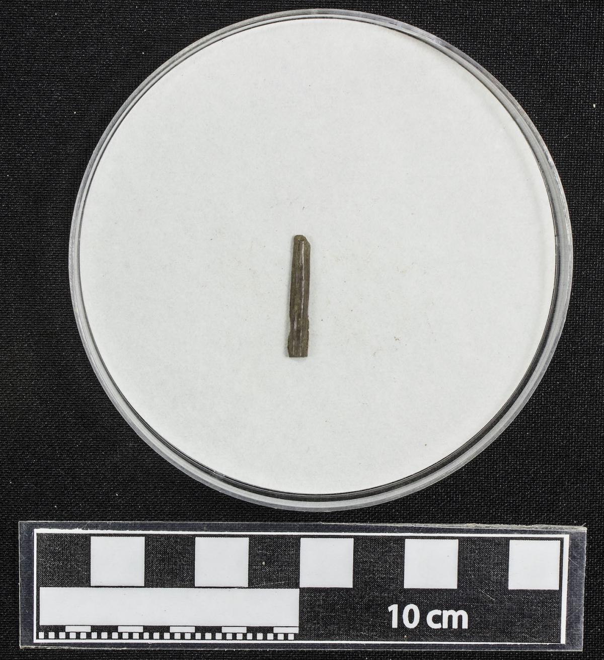 397 - Punzón-cuchilla. Se trata de un artefacto metálico de forma alargada. En un extremo es apuntada y en el opuesto presenta un filo cortante liso. Está muy oxidado.