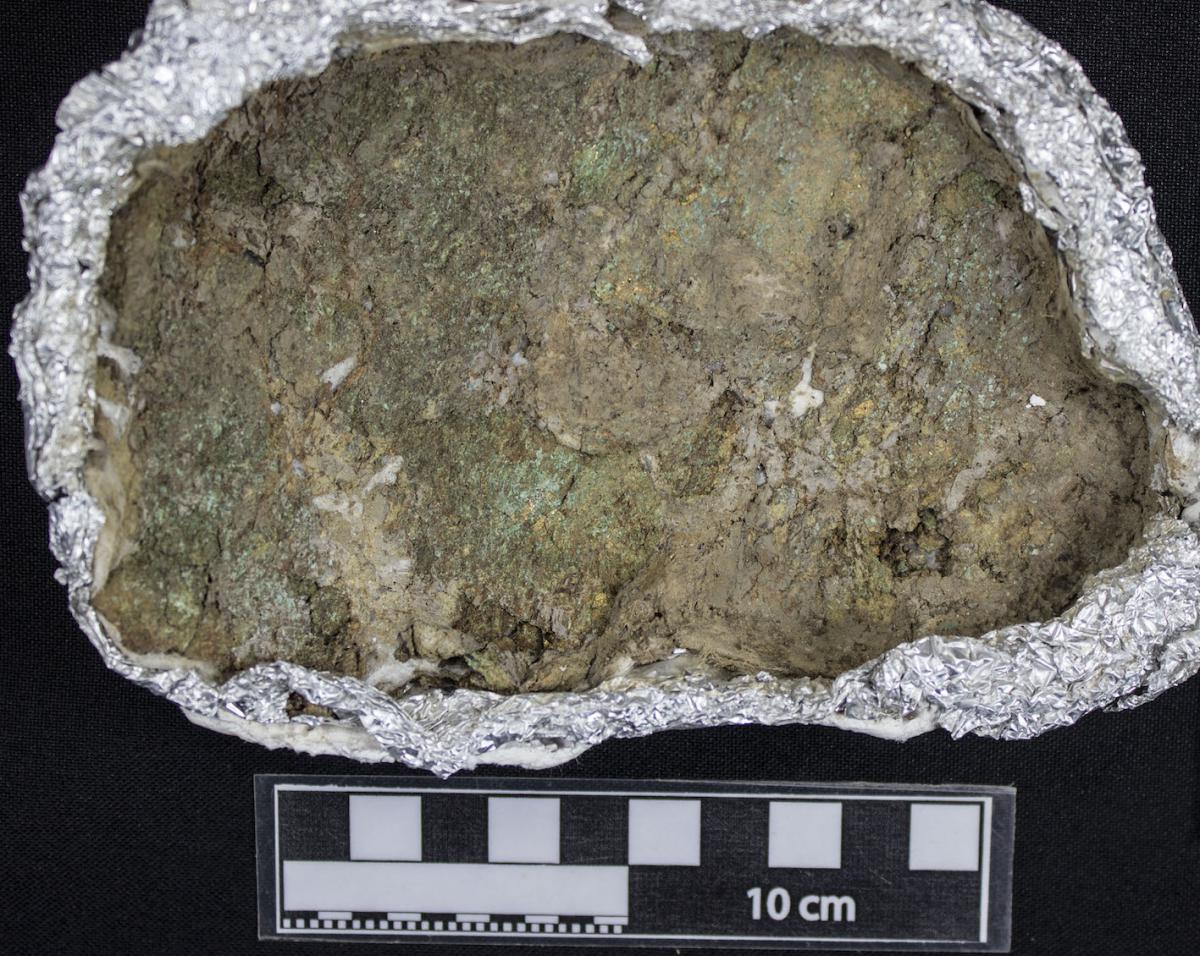 425 - Tapón de la orejera de piedra y fundas de oro registrada con el número 5083 y asociada al individuo I05 encontrado en la unidad UE088 (primer nivel de la tumba T2).