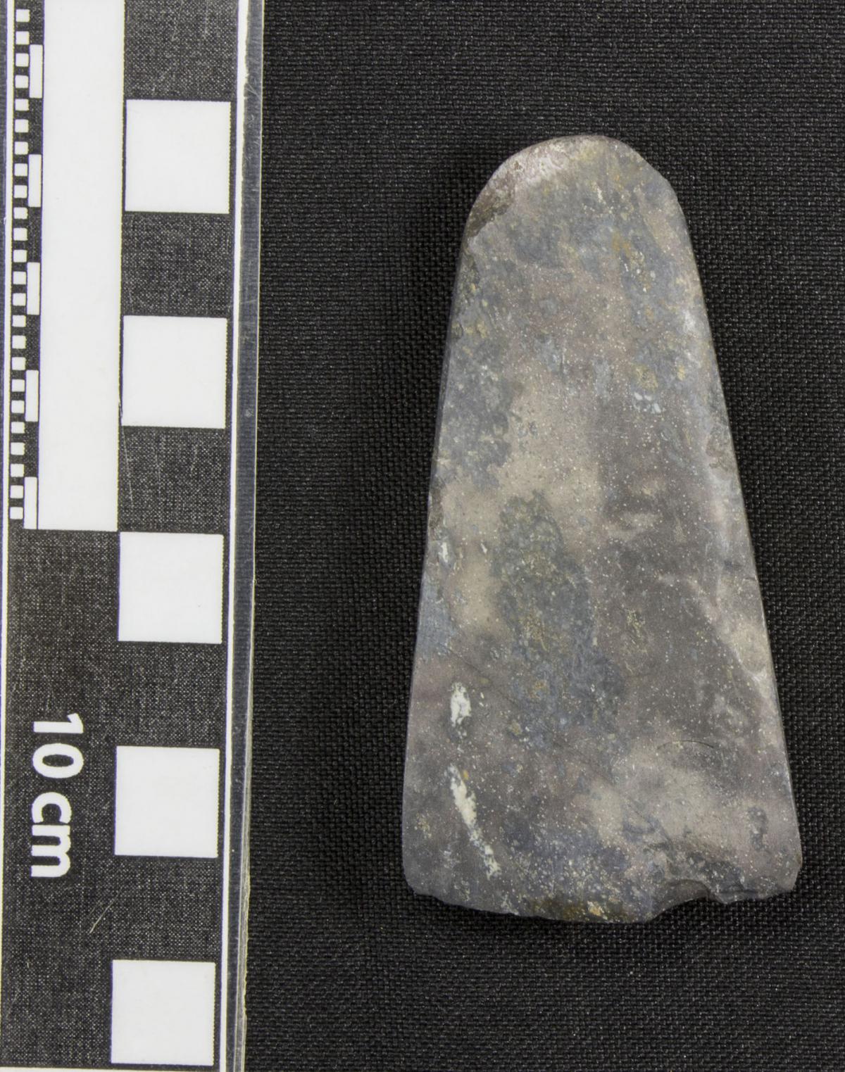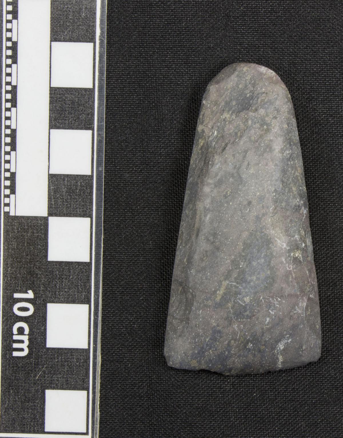 Información del recurso:  La azuela de piedra LI12135.5 fue encontrada junto con otros útiles líticos de la foto.