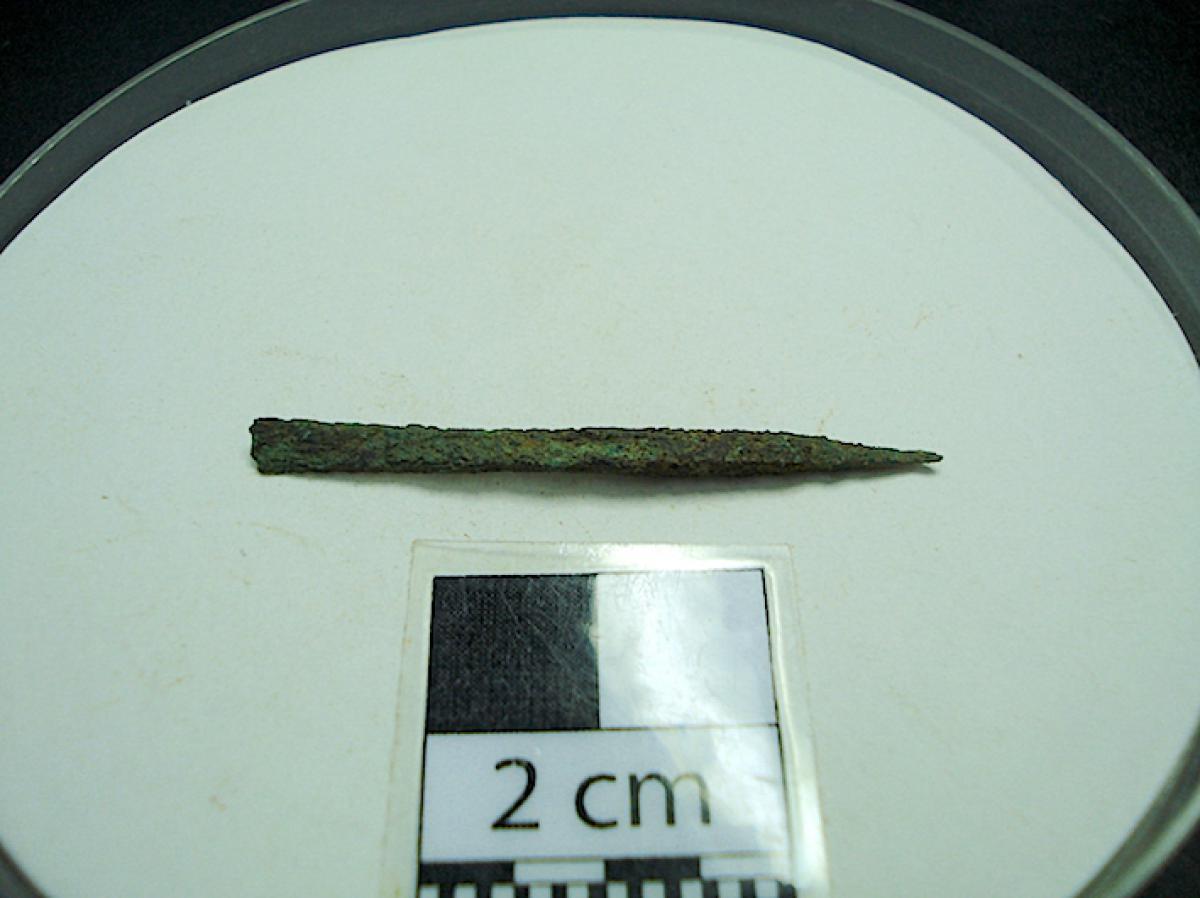 397 - Punzón-cuchilla. Se trata de un artefacto metálico de forma alargada. En un extremo es apuntada y en el opuesto presenta un filo cortante liso. Está muy oxidado.