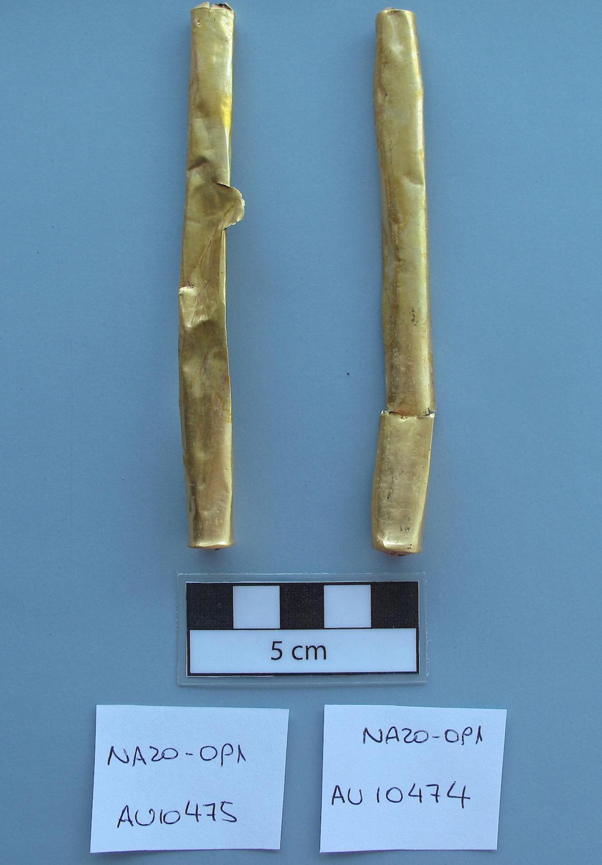 409 - Par de orejeras tubulares de piedra verde (glauconita) con fundas laminares de oro en los extremos, formaban parte del ajuar del individuo I7 de la tumba T2.