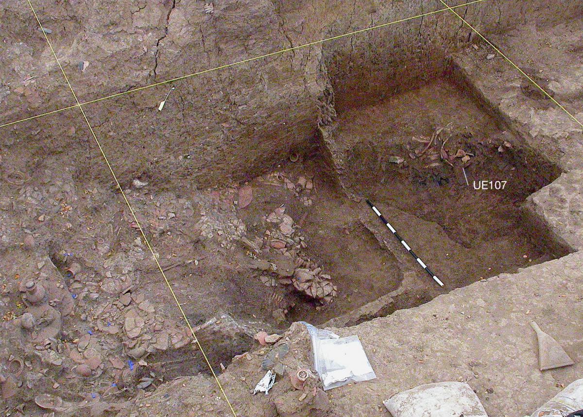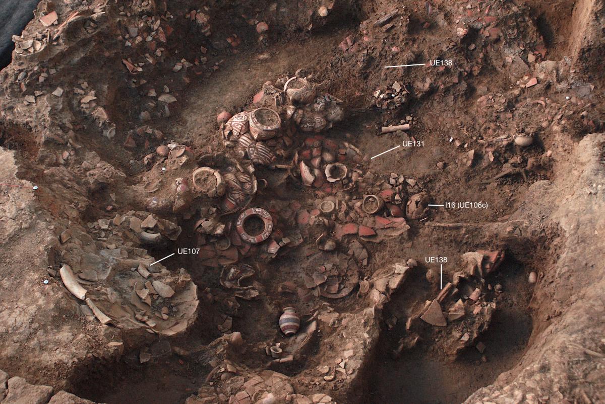 Información del recurso:  En el borde NE una gran olla partida por la mitad la usaron como incensario improvisado. UE107 Ésta contiene una gran cantidad de resinas y maderas carbonizadas