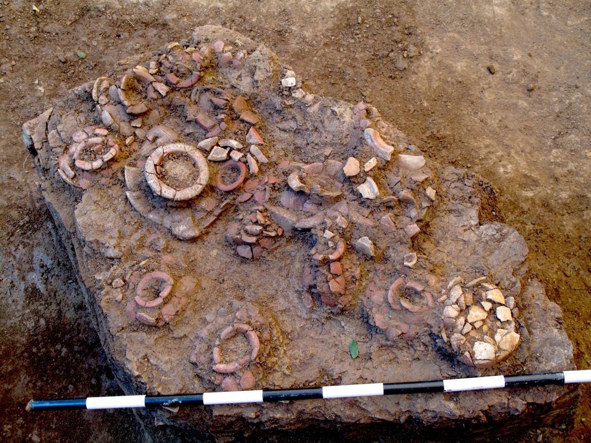 381 - T6-UE125 (a , (llamado en el año 2013, unidad UE167).Entierro de la tumba T6. Depósito de huesos humanos en posición primaria localizado a 3,48 m de profundidad. Es un entierro múltiple...