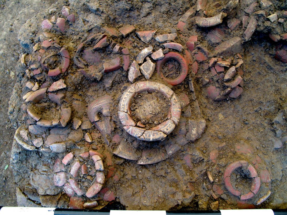 417 - T1-UE096 (a. Ofrenda colocada sobre una plataforma vegetal (Ofrenda 2) tras la colmatación de la tumba. Formada por un grupo de vasijas zoomorfas, pequeños platos, cuencos y ollas, probabl...