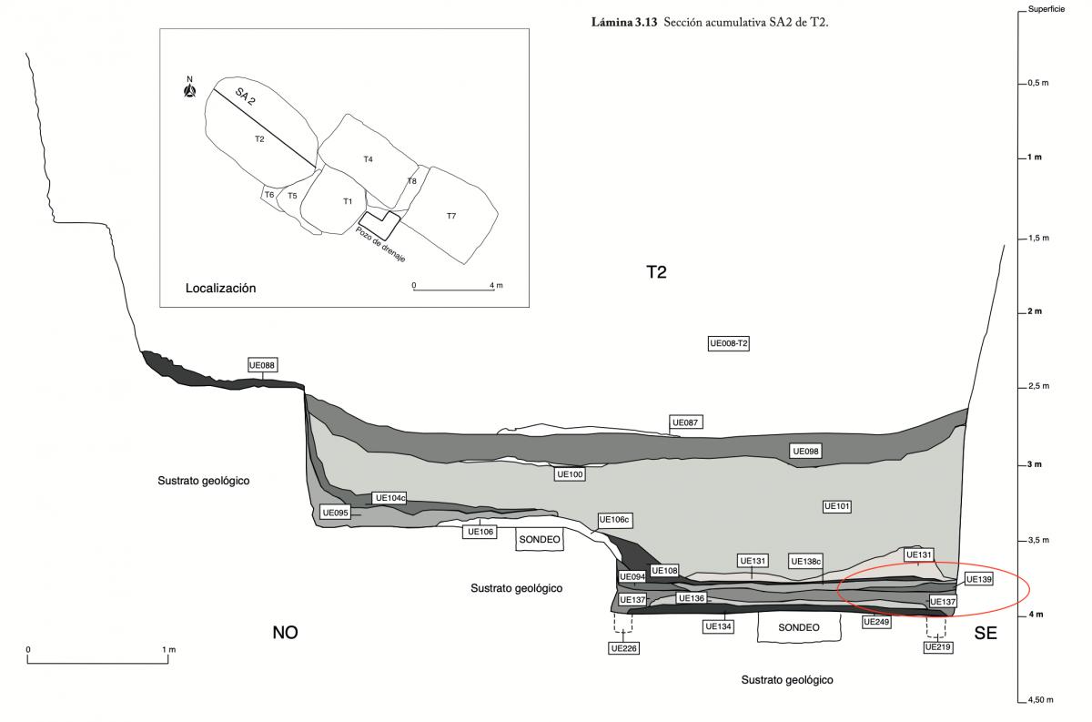 Sección acumulativa de la T2, mostrando la situación de la UE 139