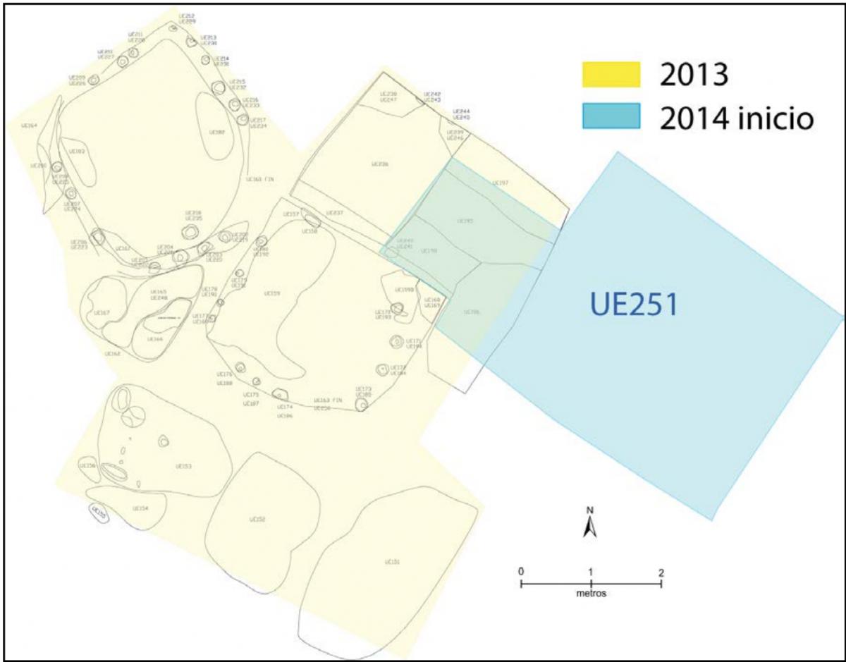 381 - T6-UE125 (a , (llamado en el año 2013, unidad UE167).Entierro de la tumba T6. Depósito de huesos humanos en posición primaria localizado a 3,48 m de profundidad. Es un entierro múltiple...