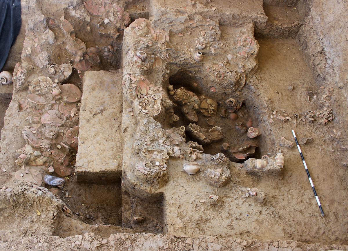 417 - T1-UE096 (a. Ofrenda colocada sobre una plataforma vegetal (Ofrenda 2) tras la colmatación de la tumba. Formada por un grupo de vasijas zoomorfas, pequeños platos, cuencos y ollas, probabl...