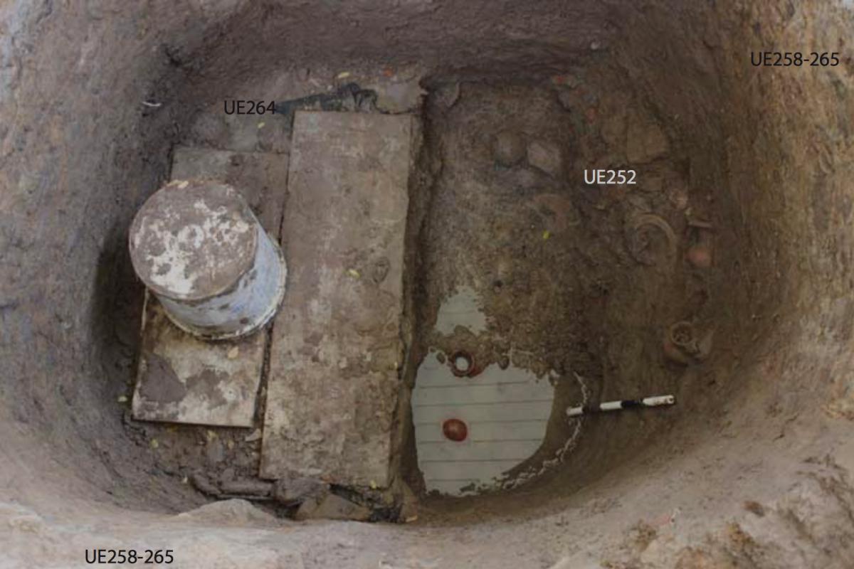 381 - T6-UE125 (a , (llamado en el año 2013, unidad UE167).Entierro de la tumba T6. Depósito de huesos humanos en posición primaria localizado a 3,48 m de profundidad. Es un entierro múltiple...