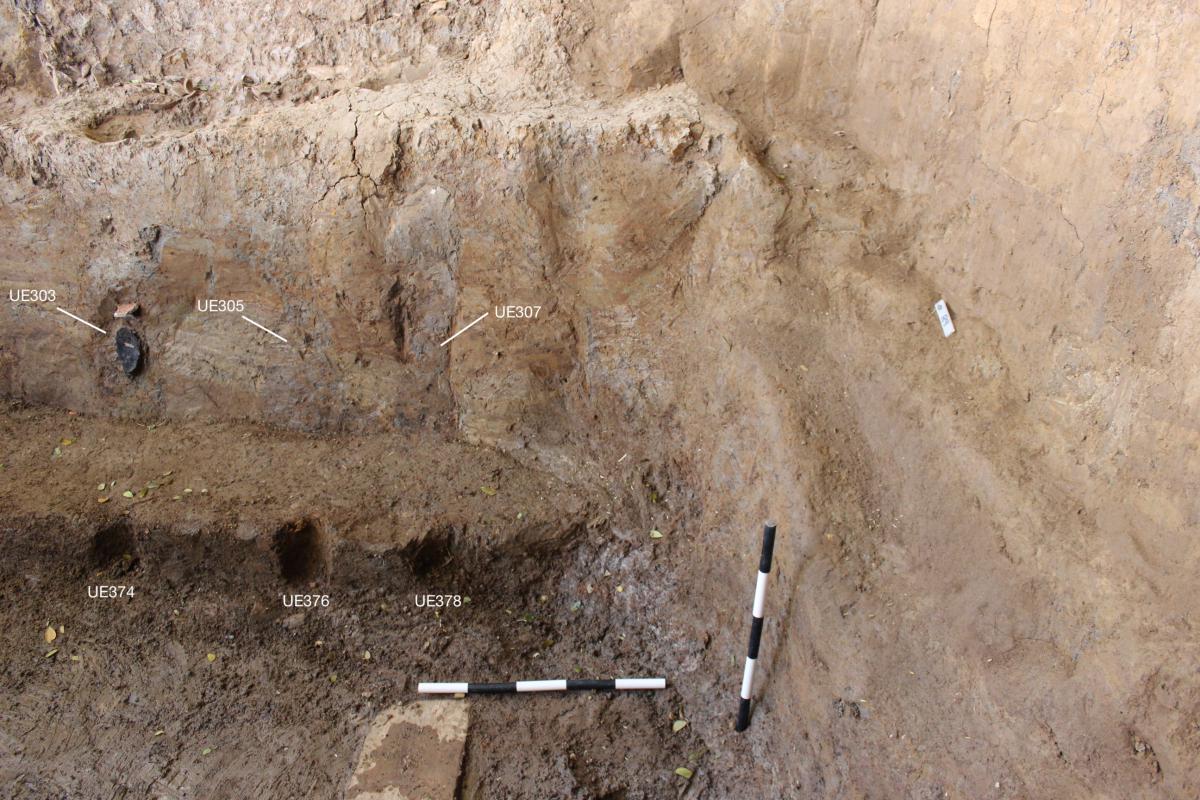 Agujeros de poste UE374, UE376, UE378 y los rellenos de improntas UE303, UE305, UE307