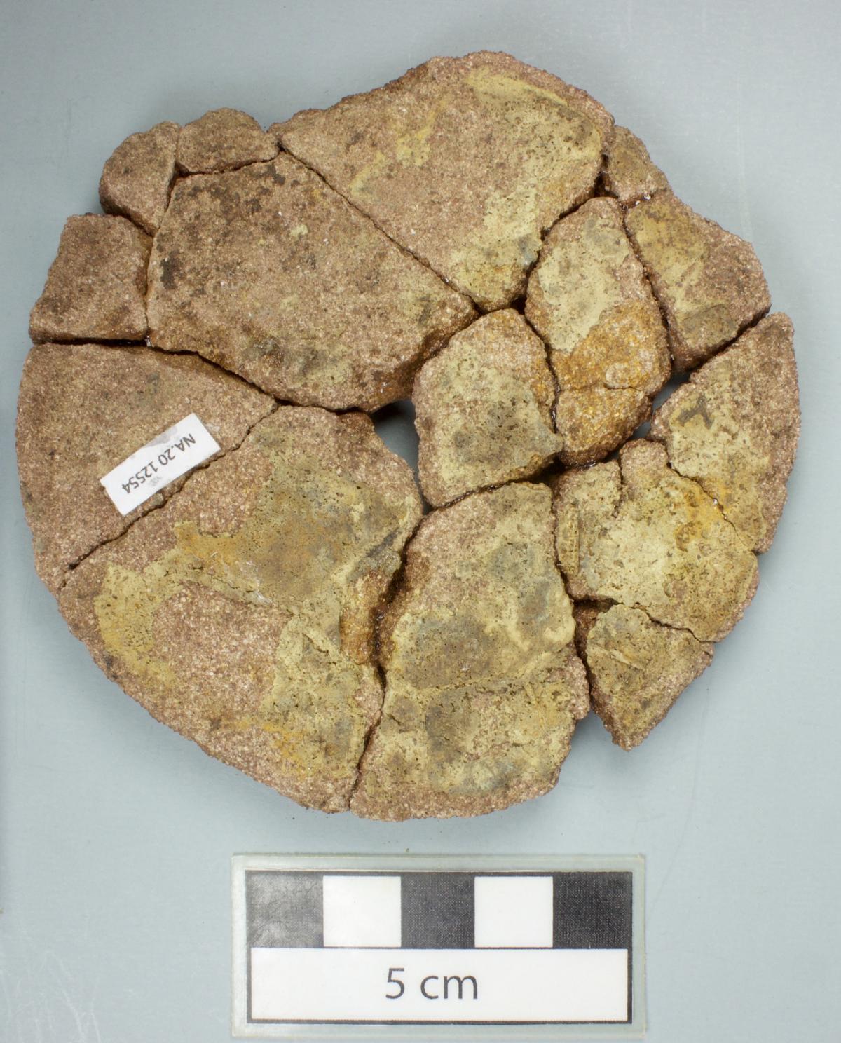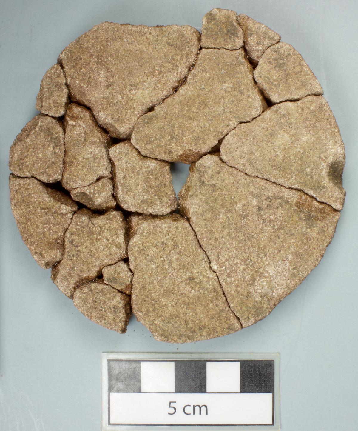 400 - Base de piedra de un espejo de pirita. Los bordes son biselados. Fragmentos de un artefacto completo.