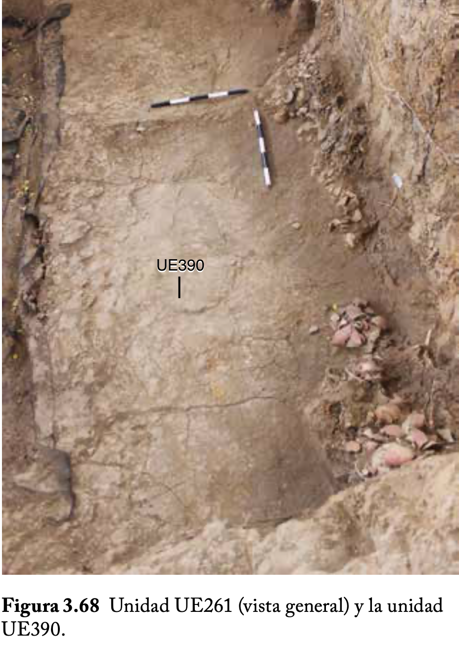 381 - T6-UE125 (a , (llamado en el año 2013, unidad UE167).Entierro de la tumba T6. Depósito de huesos humanos en posición primaria localizado a 3,48 m de profundidad. Es un entierro múltiple...