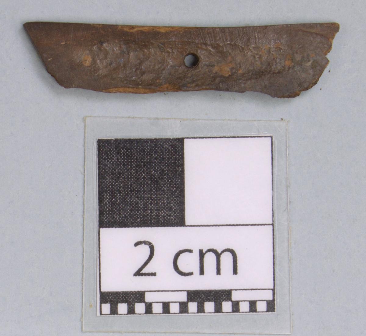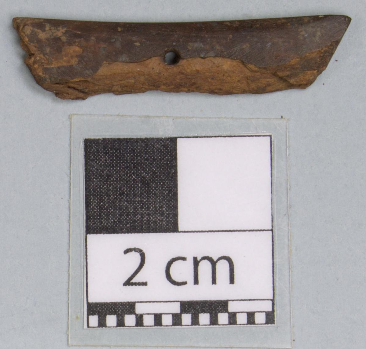 Información del recurso:  Artefacto de forma rectangular con perforación.