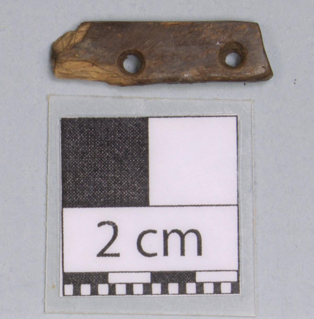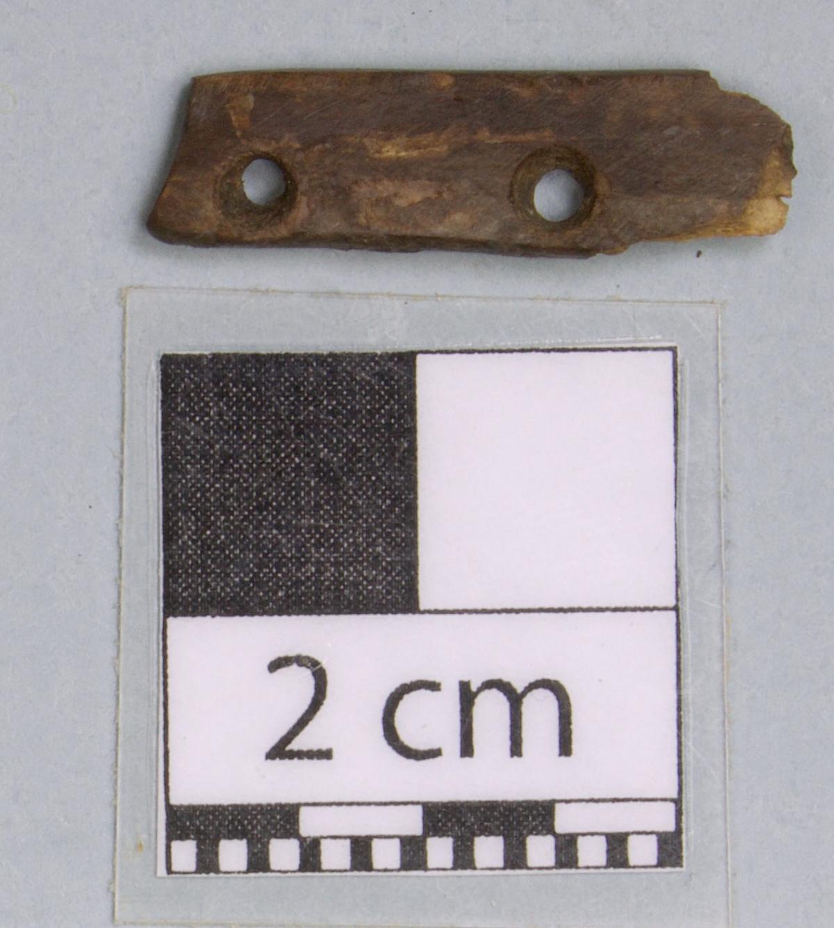 Información del recurso:  Fragmento de artefacto de forma alargada y dos perforaciones. Lado 2.
