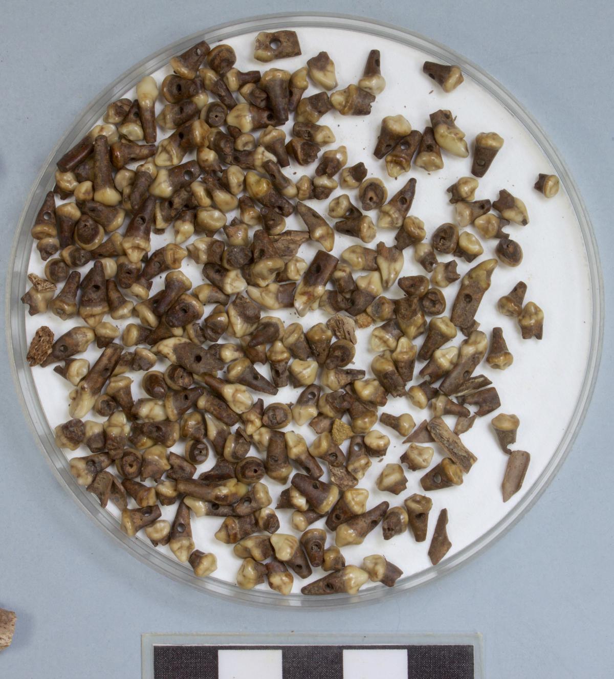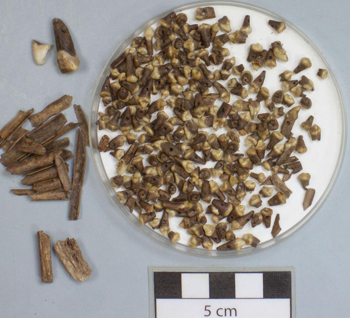 Información del recurso:  Dientes y premolares perforados junto a otros artefactos de hueso y diente recuperados en el mismo punto.