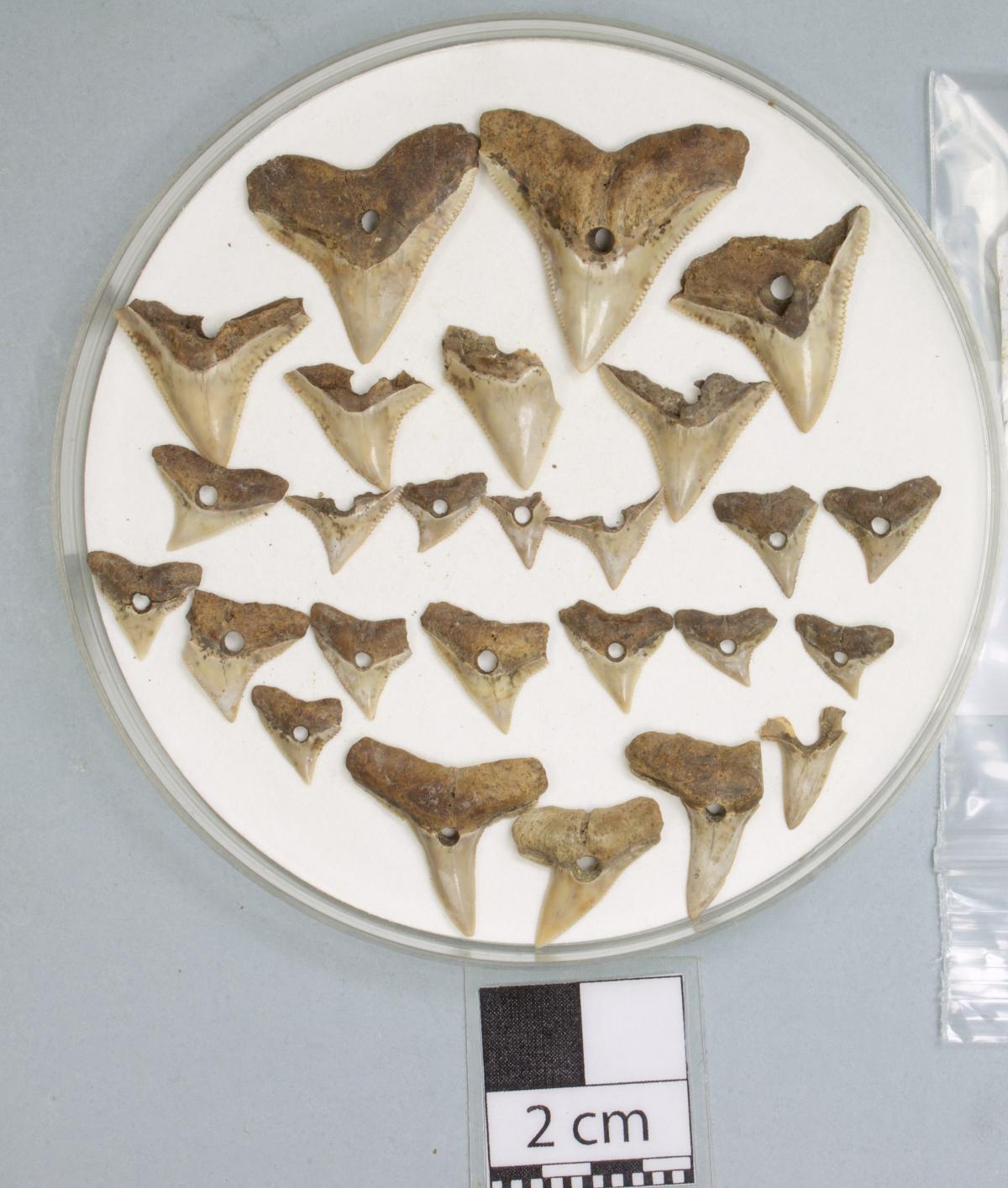 3571 - Diente perforado de tiburón. La perforación indica que pudo haber formado parte de un artefacto ornamental.