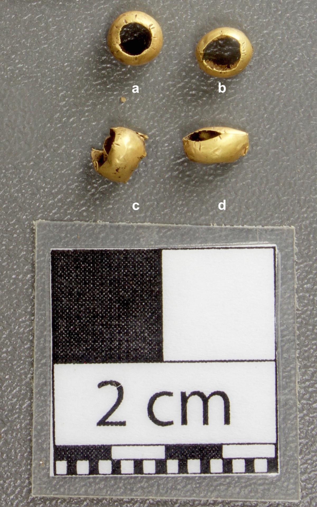 448 - Hemiesferas de oro perforadas. La media esfera 6528.1 tiene cuatro perforaciones y la media esfera 6528.2 tiene 8 perforaciones.
