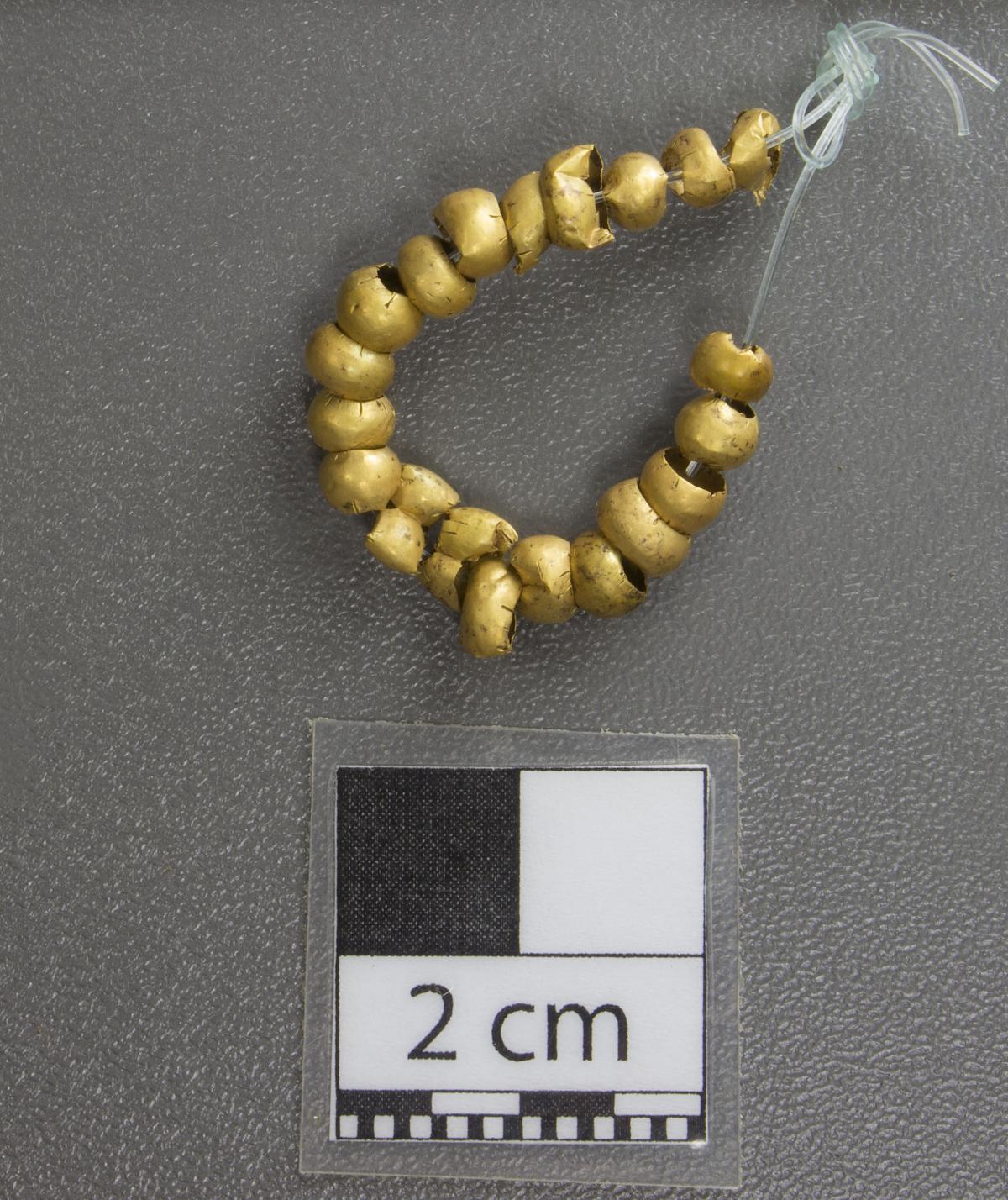454 - Pulsera compuesta por 39 cascabeles de oro fundido que tienen un espesor alrededor de 2 mm oscilando sus tamaños entre 9 y 13 mm de diámetro y 11 a 16 mm de largo. El objeto formaba parte ...