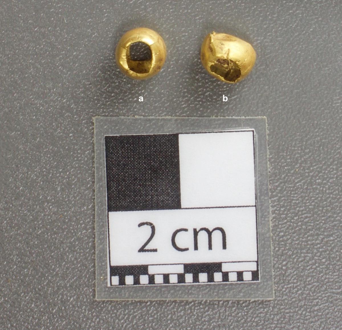 448 - Hemiesferas de oro perforadas. La media esfera 6528.1 tiene cuatro perforaciones y la media esfera 6528.2 tiene 8 perforaciones.
