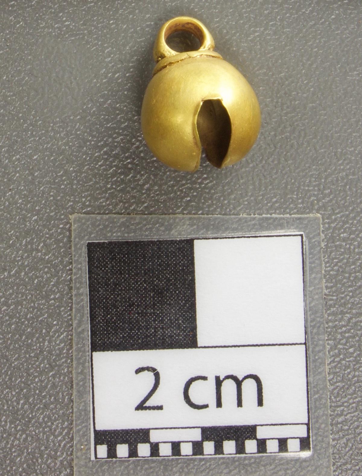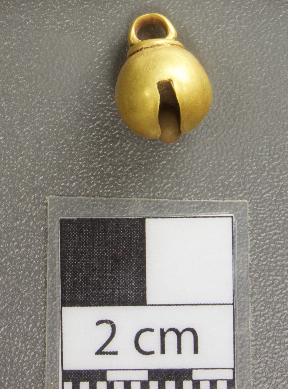 454 - Pulsera compuesta por 39 cascabeles de oro fundido que tienen un espesor alrededor de 2 mm oscilando sus tamaños entre 9 y 13 mm de diámetro y 11 a 16 mm de largo. El objeto formaba parte ...