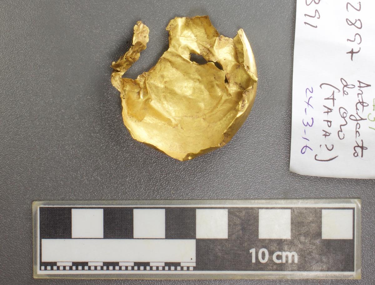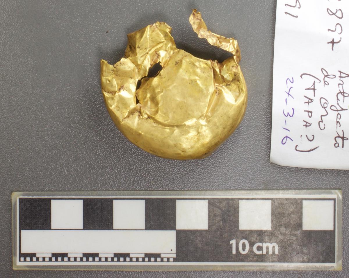 387 - Pectoral de oro martillado repujado con la representación frontal del rostro de un ser sobrenatural con rasgos de un anciano que formaba parte del ajuar del Individuo 20, un infante, de la ...