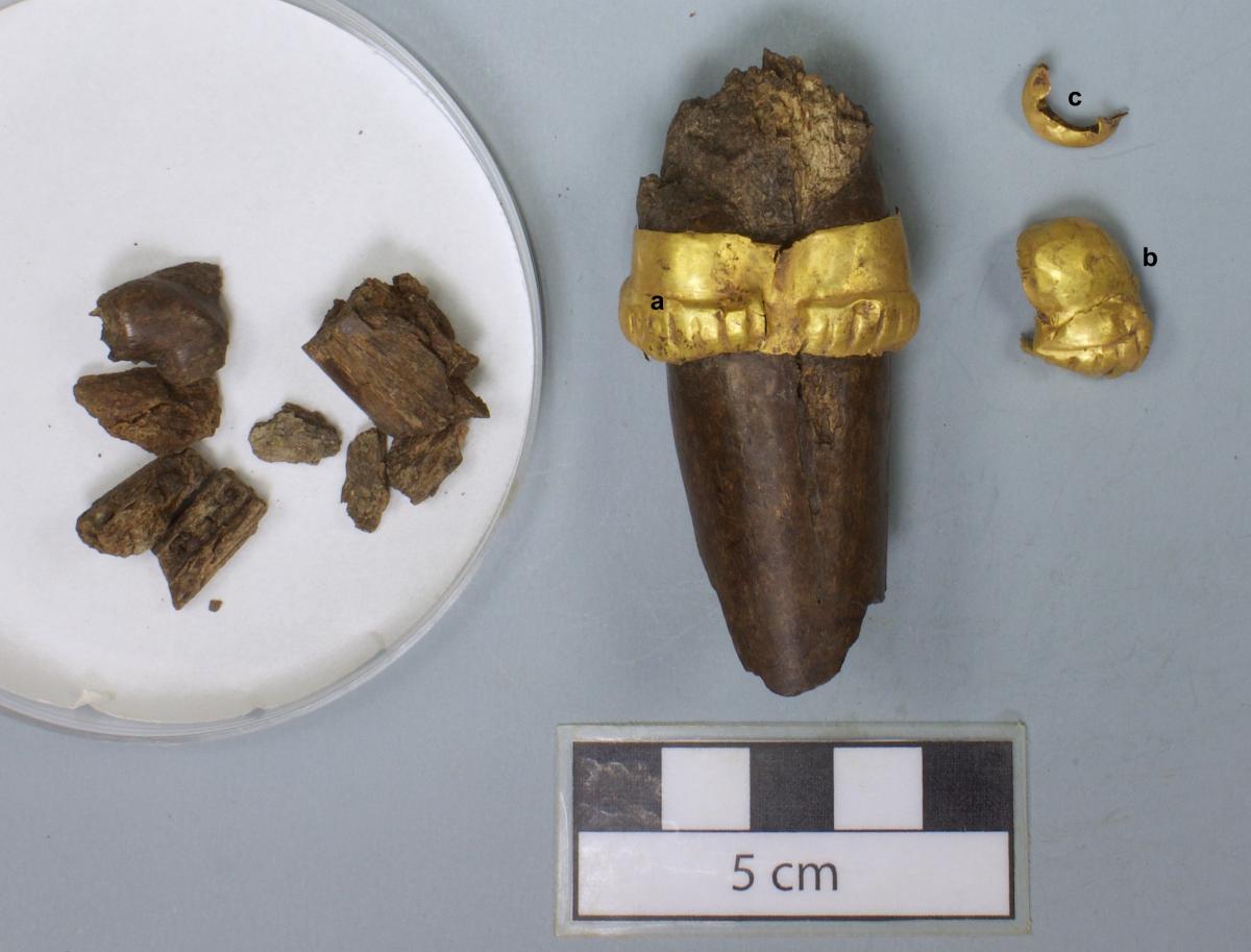 Fragmento de costilla de manatí tallada con fundas de oro.