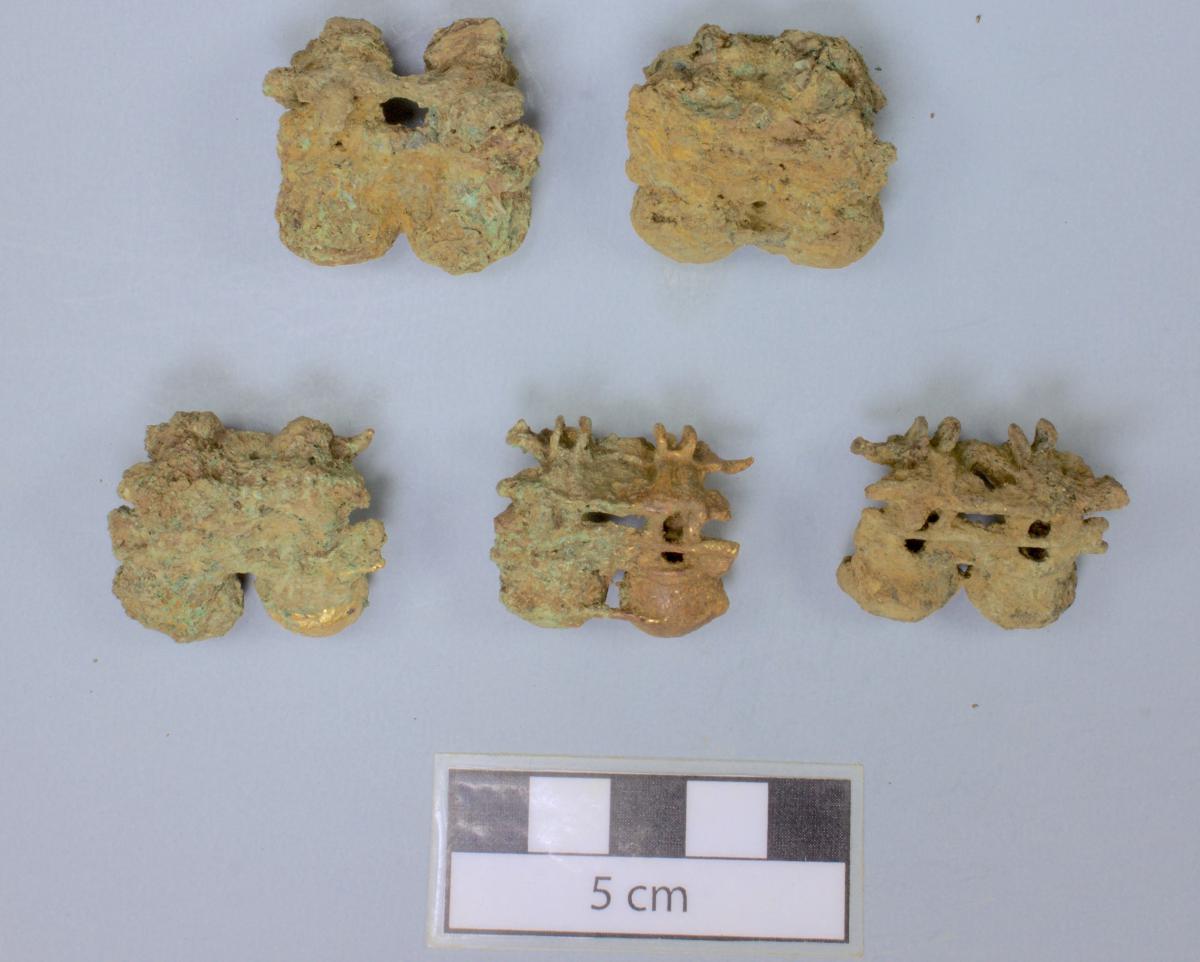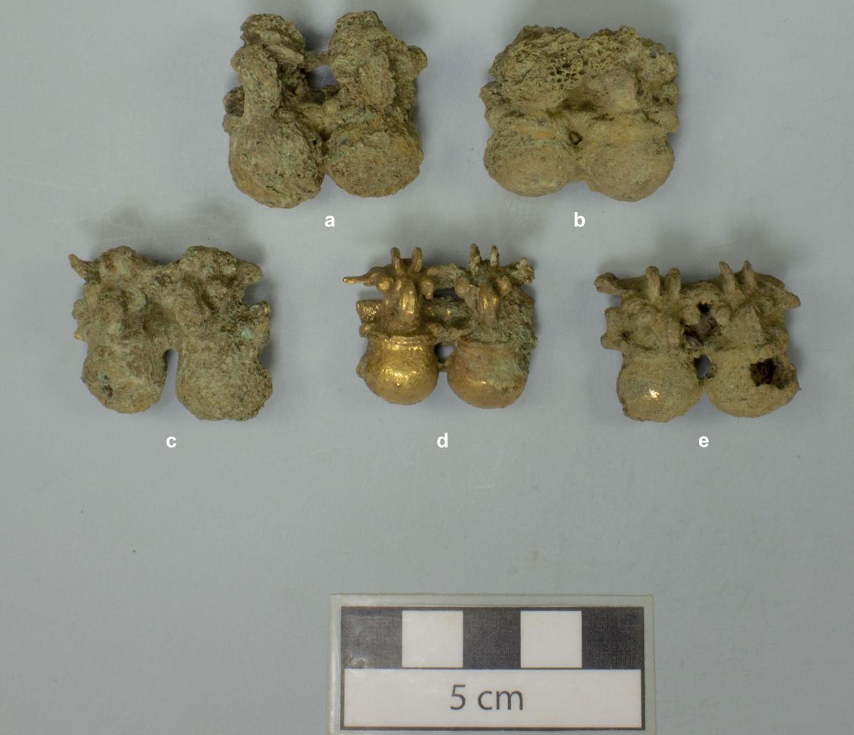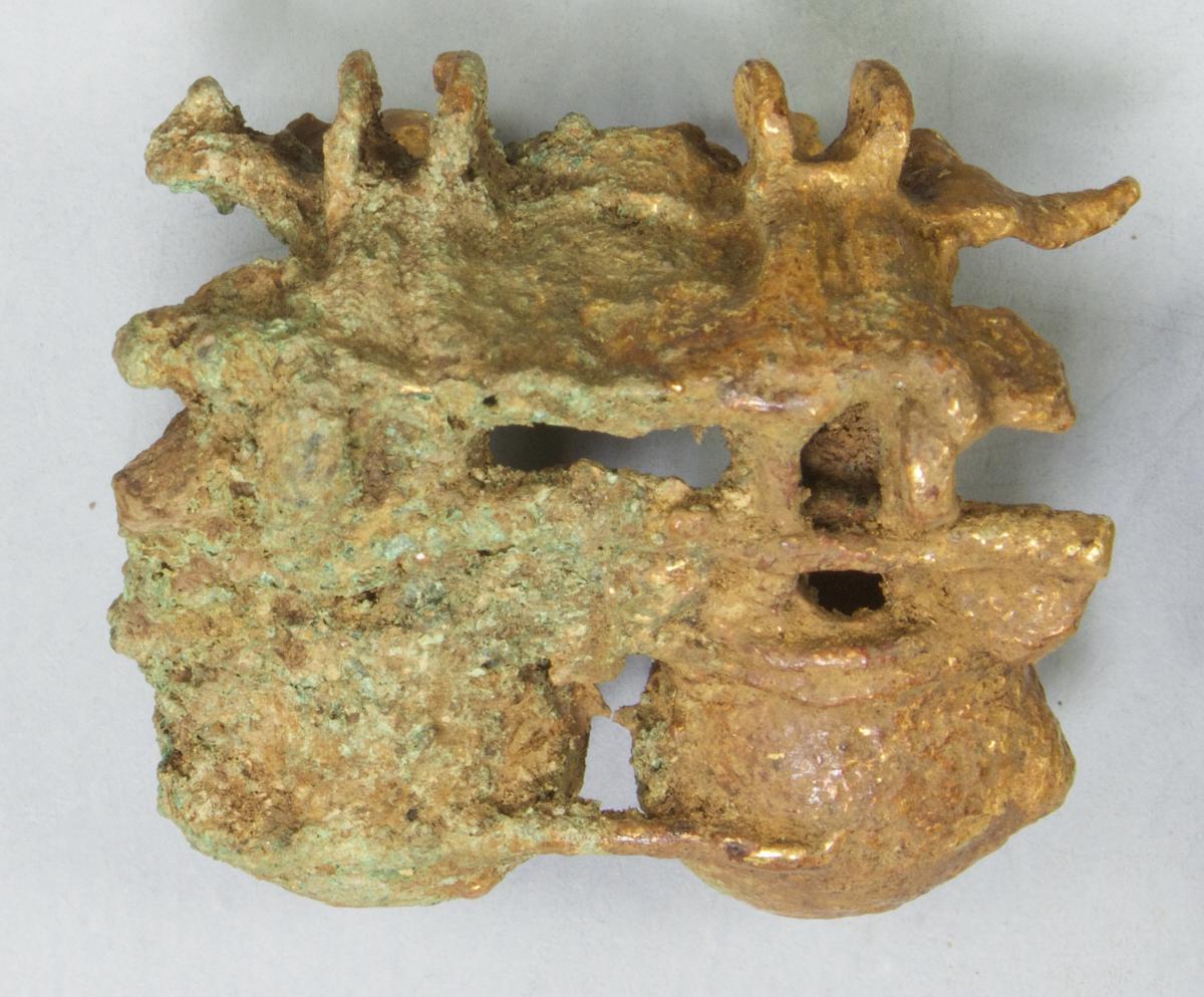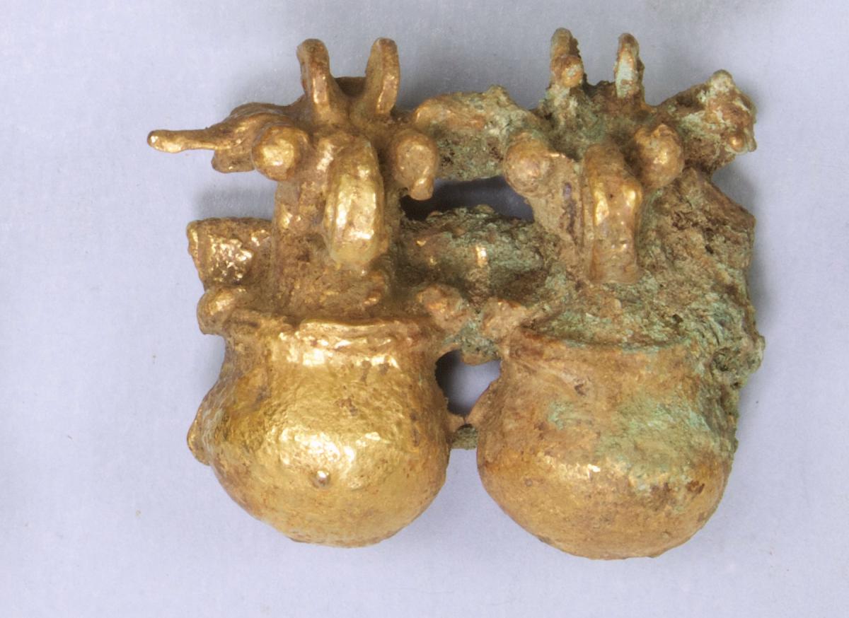 464 - Pendiente figurativo de tumbaga fundido. La figura tiene dos posibles lecturas: dos langostas espinosas sobrenaturales portan sendas cabezas humanas en sus carapachos o bien dos personajes c...