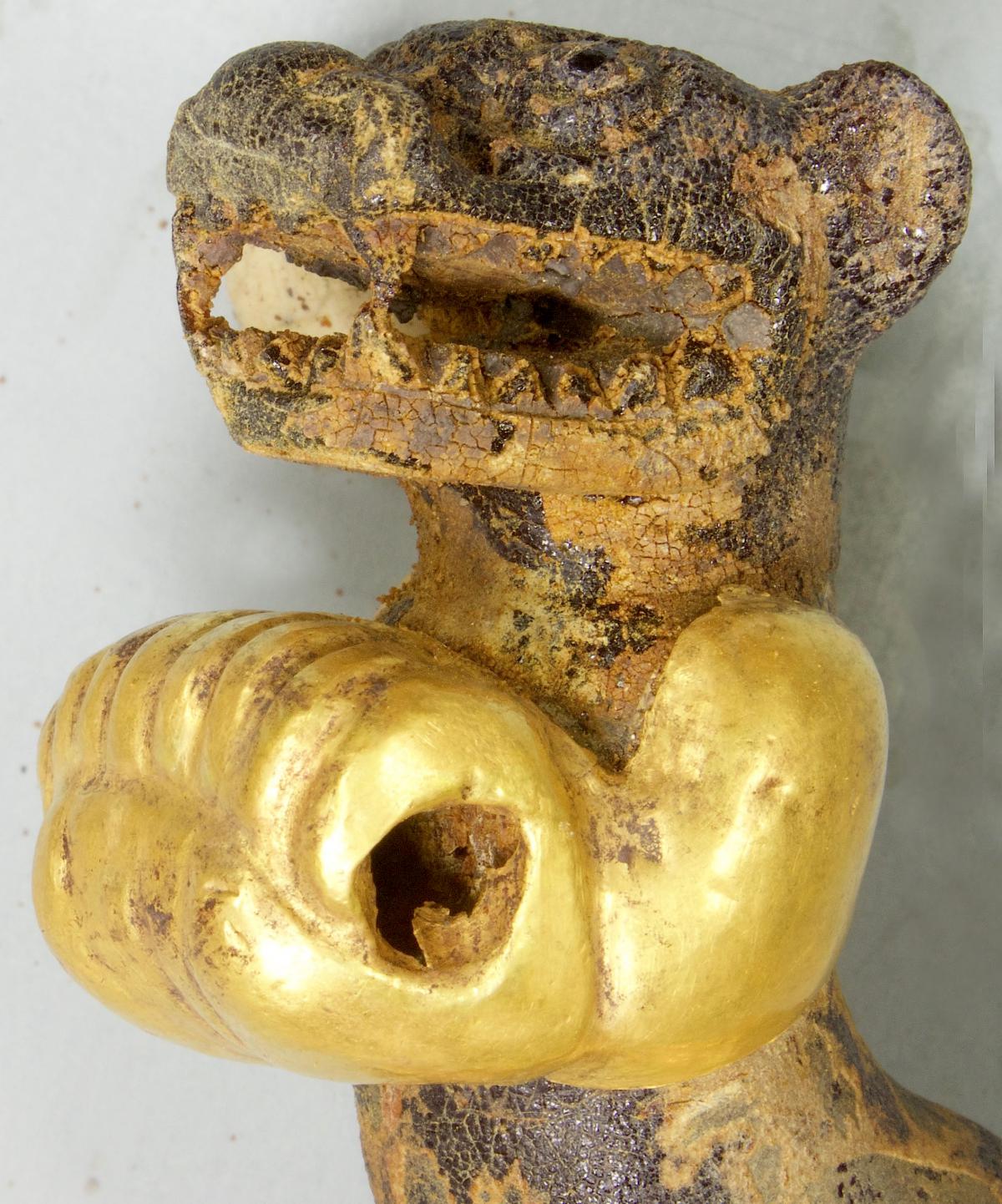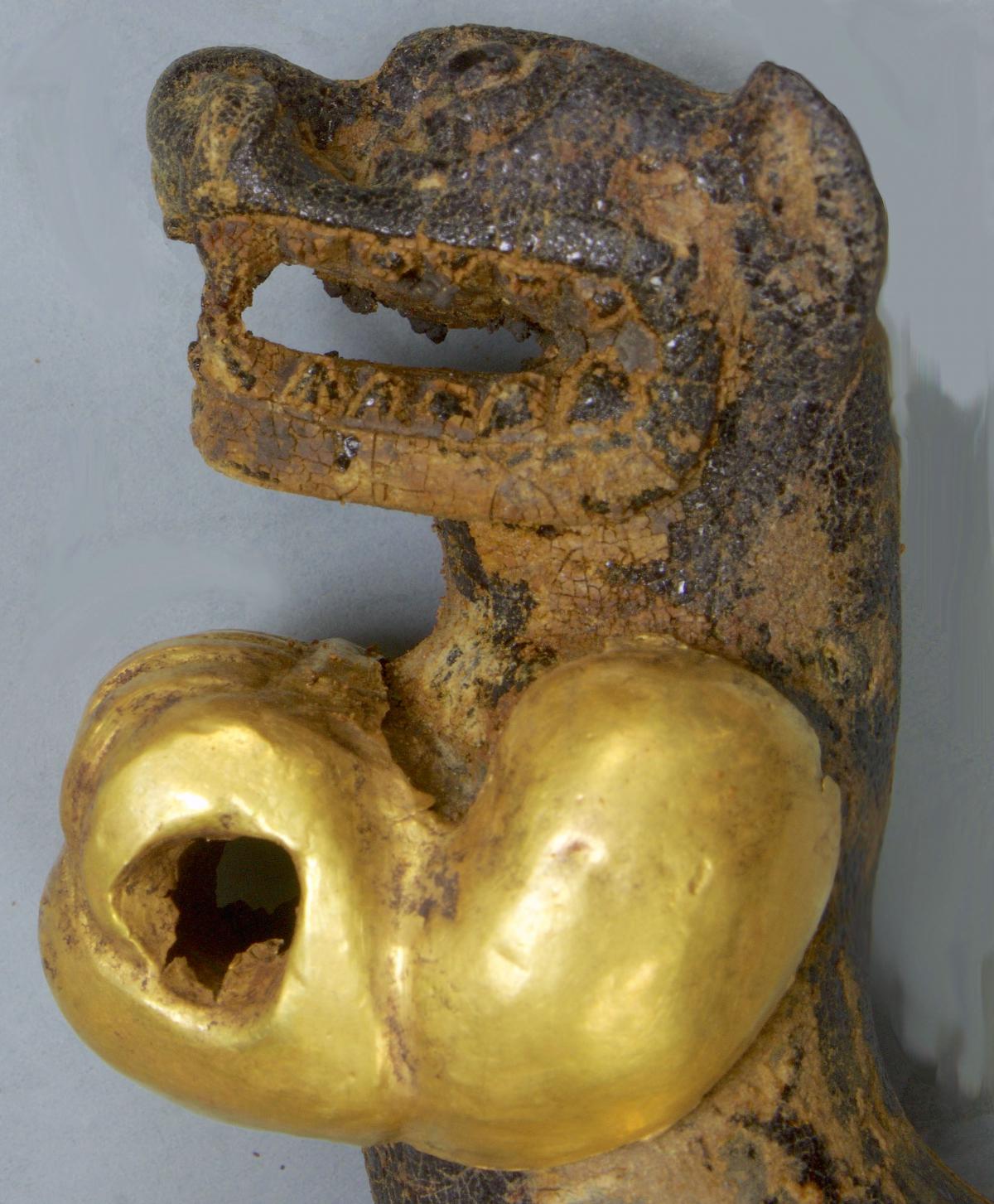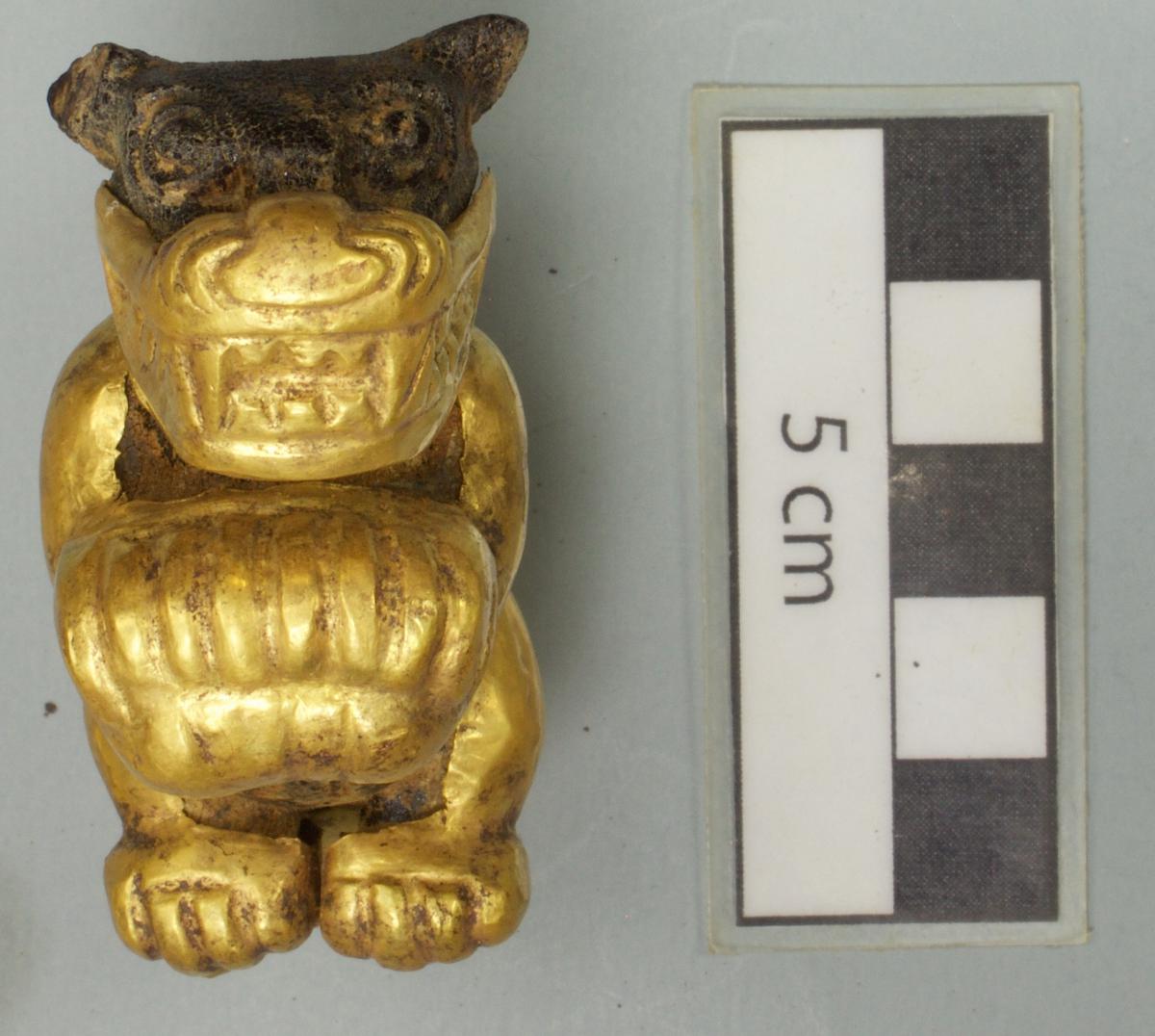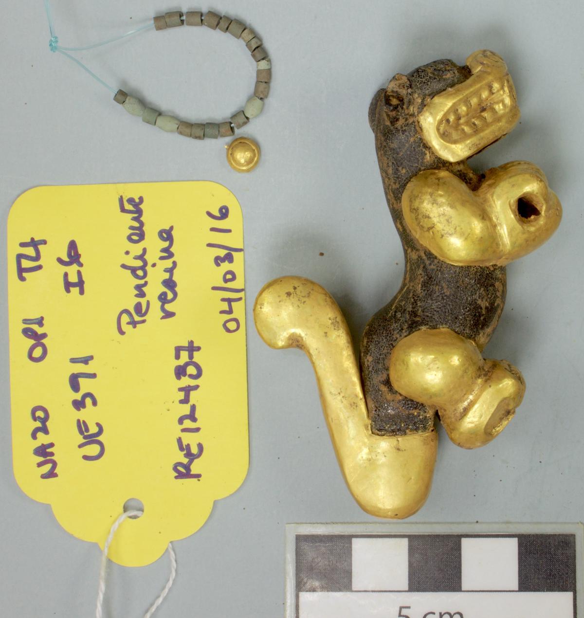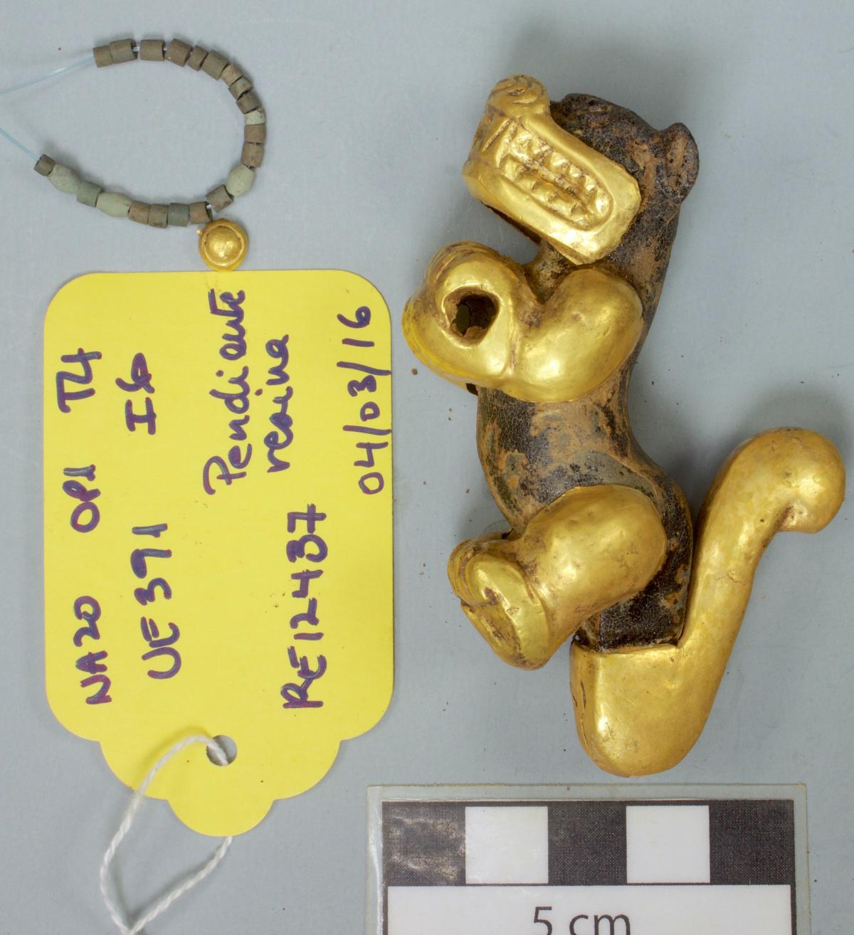 377 - Pendiente figurativo de oro fundido con la representación de un murciélago bicéfalo en vuelo que formaba parte del ajuar del individuo I5 de la tumba T2. EL aro de suspensión se localiza...