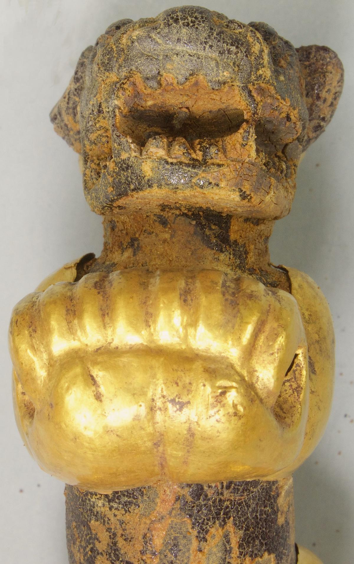 387 - Pectoral de oro martillado repujado con la representación frontal del rostro de un ser sobrenatural con rasgos de un anciano que formaba parte del ajuar del Individuo 20, un infante, de la ...