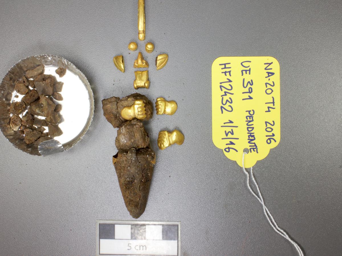 398 - Pendiente figurativo de oro fundido que formaba parte del ajuar del individuo I9 de la tumba T2. Es una figura masculina bicéfala desnuda en pie que sostiene con ambas manos una trompeta ce...