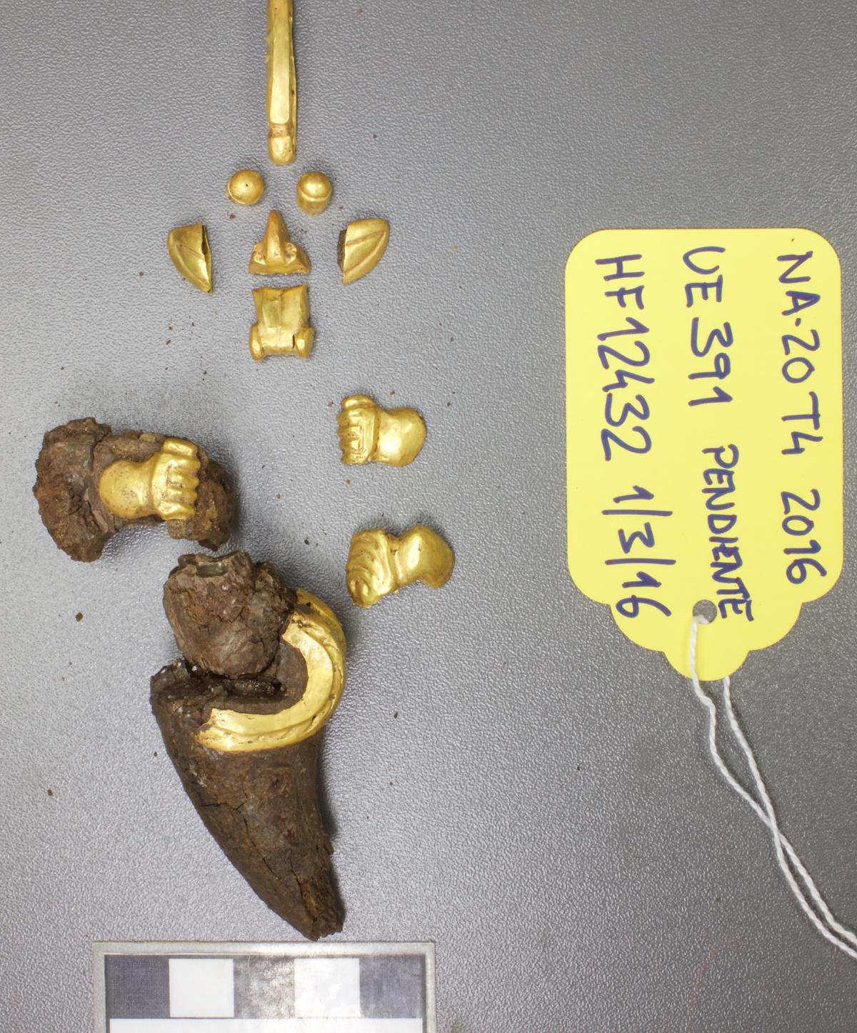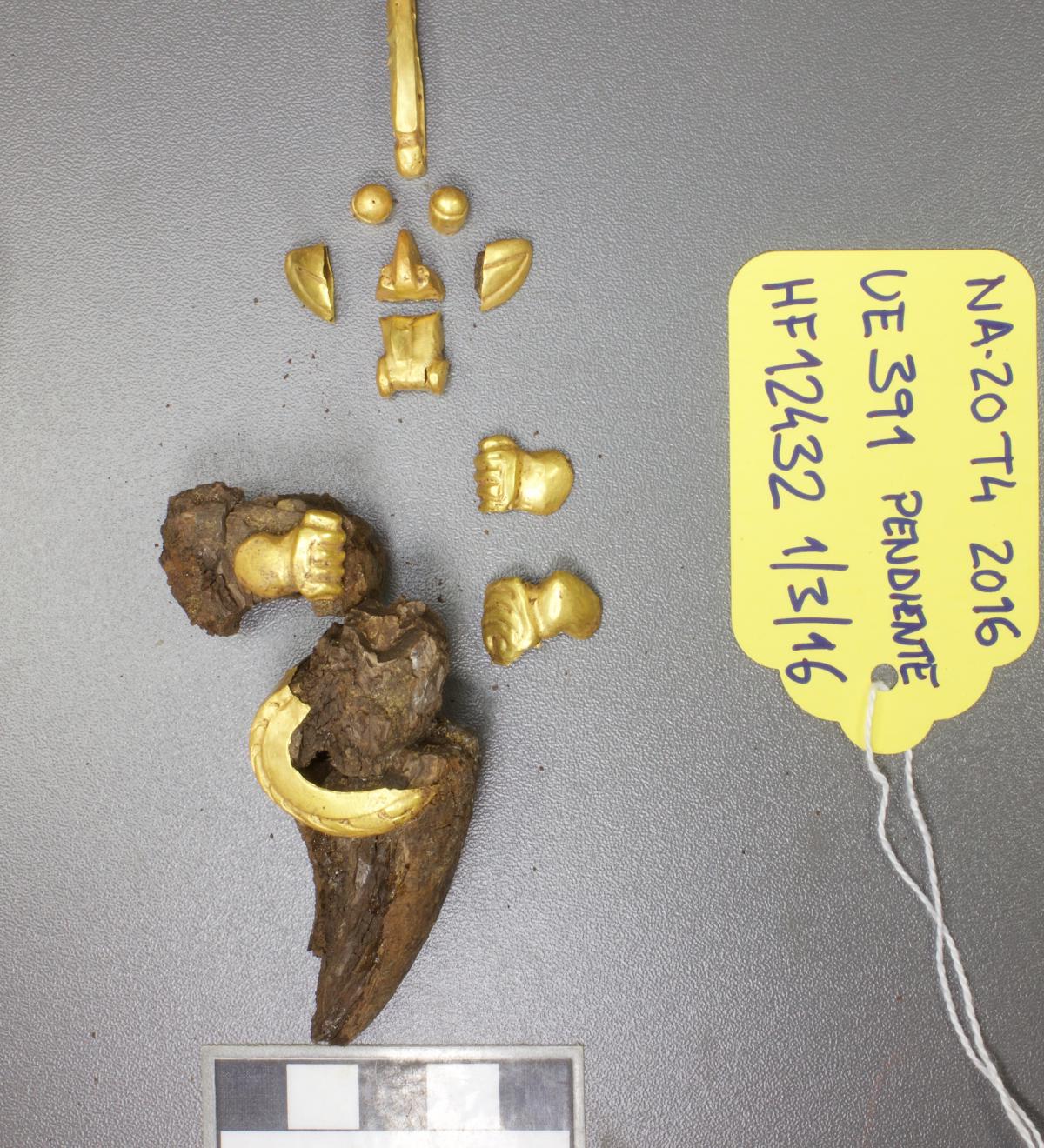 377 - Pendiente figurativo de oro fundido con la representación de un murciélago bicéfalo en vuelo que formaba parte del ajuar del individuo I5 de la tumba T2. EL aro de suspensión se localiza...