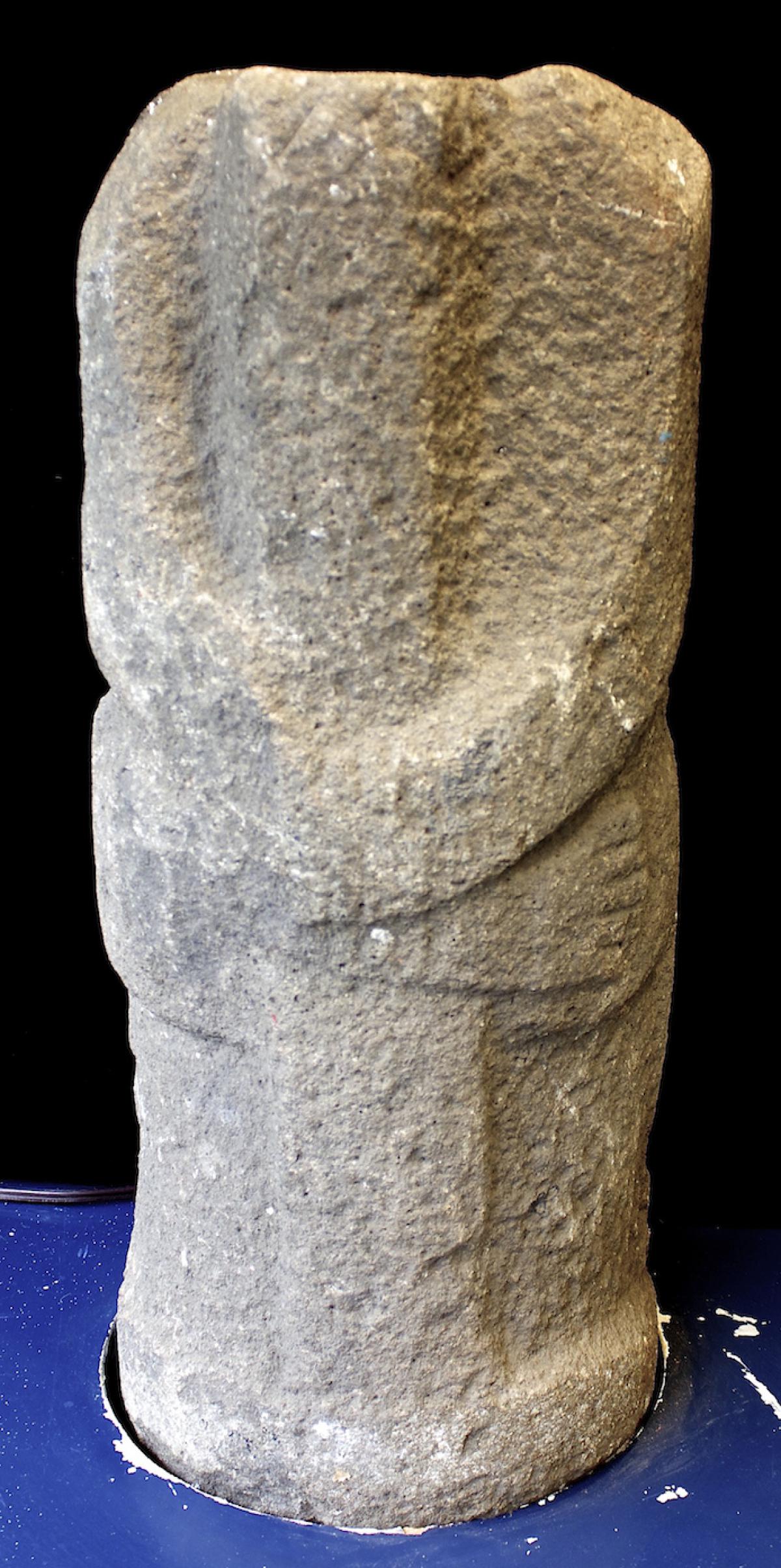 Información del recurso:  Mono-escena representando a un varón decapitado que lleva un pectoral y está atado a una columna basáltica. Aunque a primera vista pueda parecer que le falta la cabeza, el buen acabado de su parte superior, hace pensar que la pieza representa a un hombre decapitado. El pectoral indicaba que era una persona de alto estatus. Si se relaciona la figura de este varón decapitado con la presencia de cabezas cortadas en las tumbas de los individuos de alto estatus enterrados con acompañantes, se puede inferir que estas esculturas hacen referencia a sacrificios humanos.