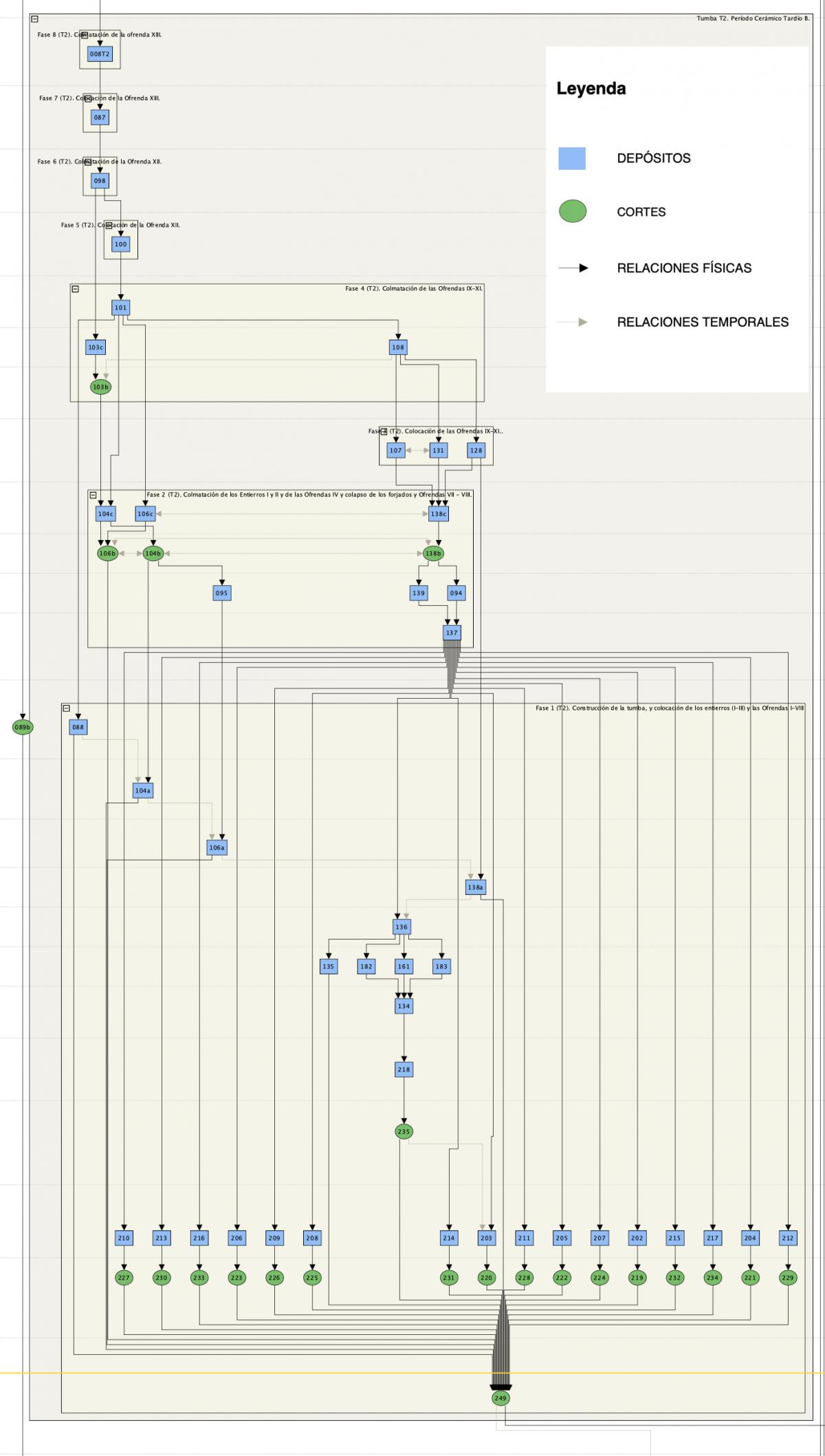 Las flechas de color gris claro y trazado discontinuo representan las relaciones cronológicas, - la sincronía se expresa con flechas de trazado horizontal, mientras que la relación entre unidades no contemporáneas se expresa con flechas de trazo vertical.