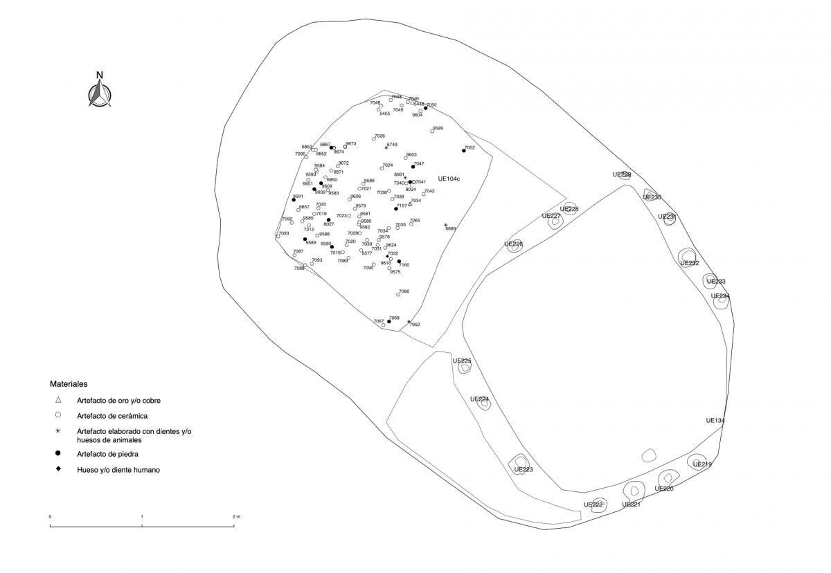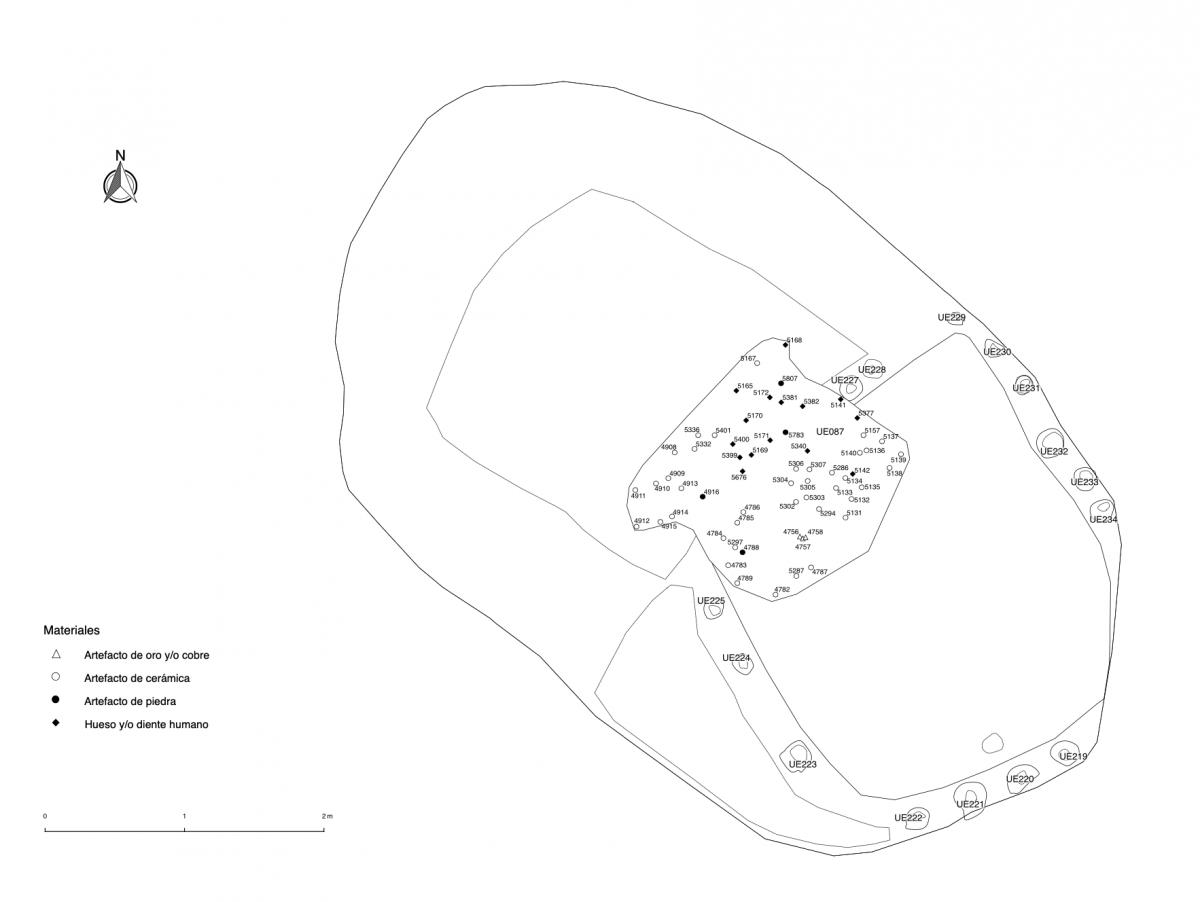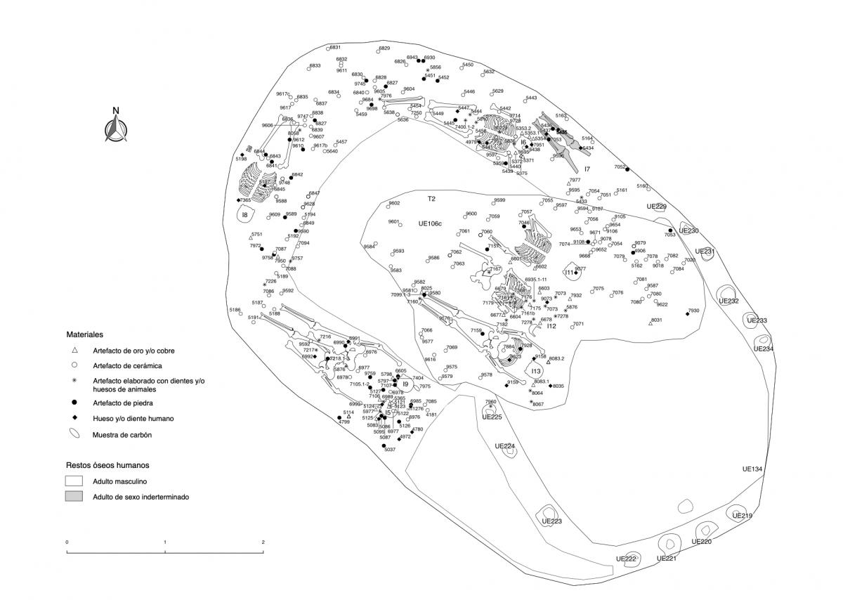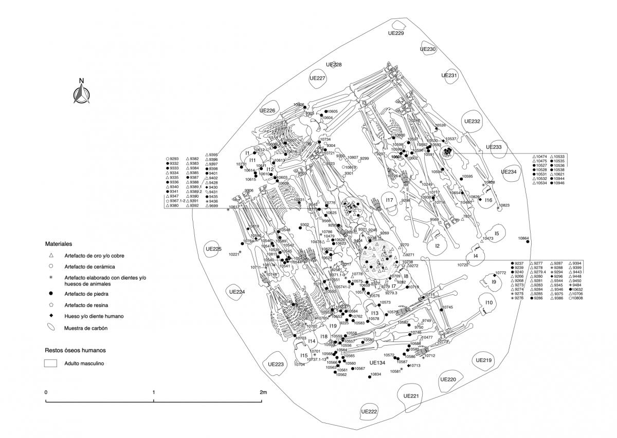 Información del recurso:  Conjunto de tres cuerpos (I11, I12 e I13) enterrados en el segundo nivel de la tumba T2. Todos fueron colocados en decúbito prono con las cabezas al SE. Todo el depósito tiene un buzamiento de 35° grados de NW a SE. El esqueleto principal viste un pectoral, dos brazaletes y orejeras de oro.