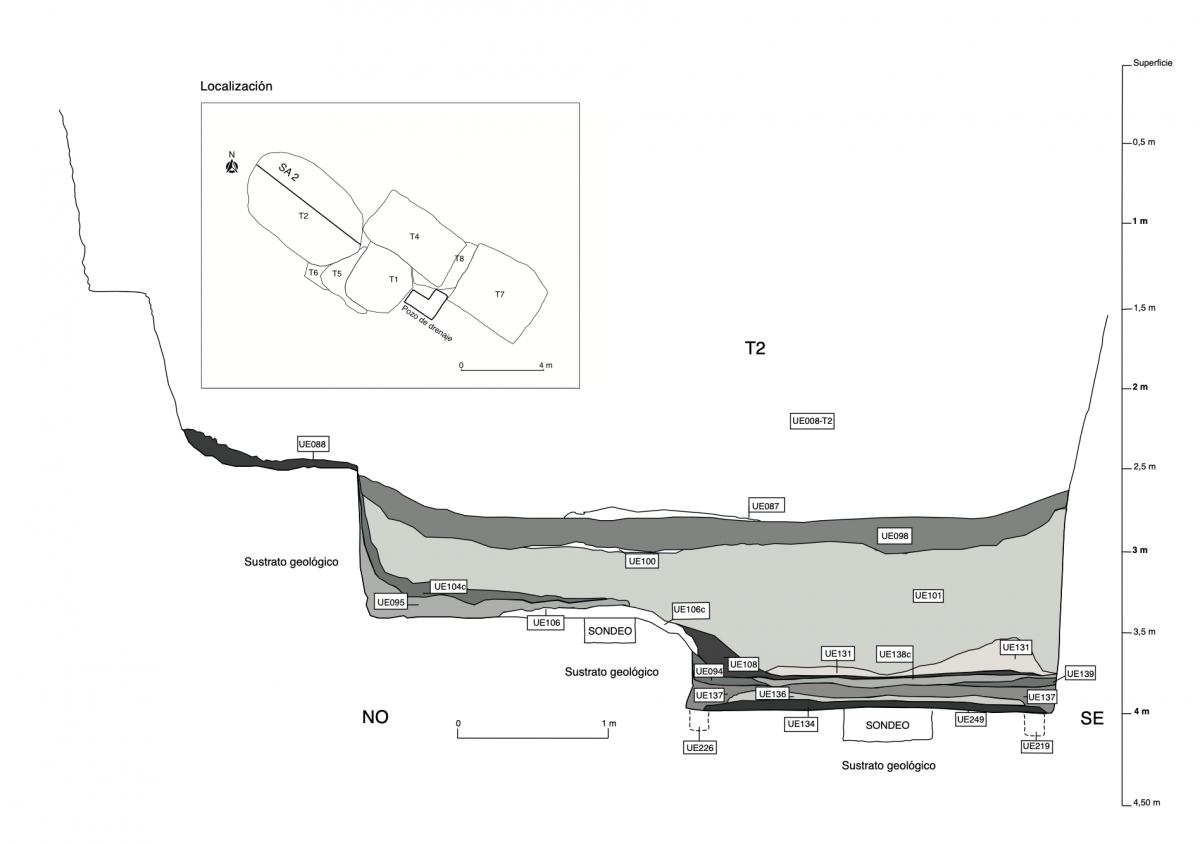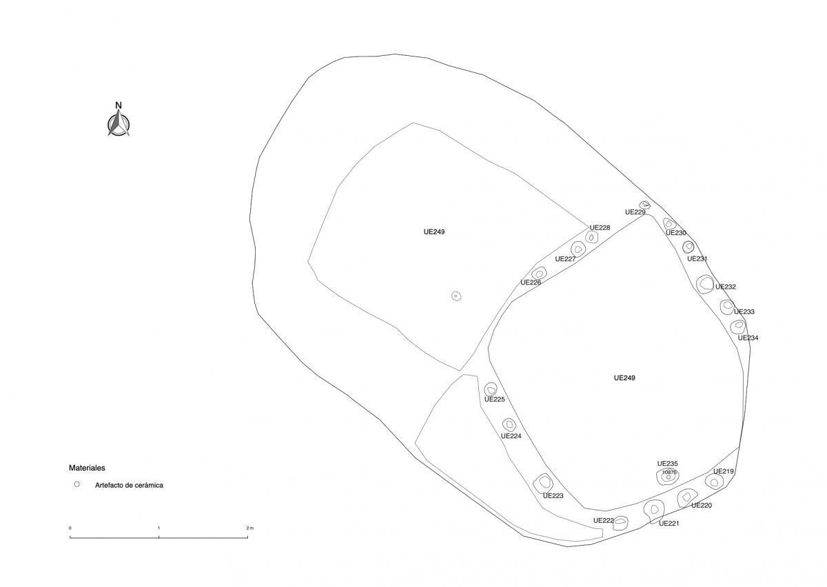 Información del recurso:  Fosa de enterramiento de la tumba T2. Corta el nivel natural. Contiene a las unidad estratigráficas UE160, UE161, UE164, UE182 y UE183. Es cortada por las unidades UE202, UE203, UE204, UE205, UE206, UE207, UE208, UE209, UE210, UE211, UE212, UE213, UE214, UE215, UE216, UE217 y UE218