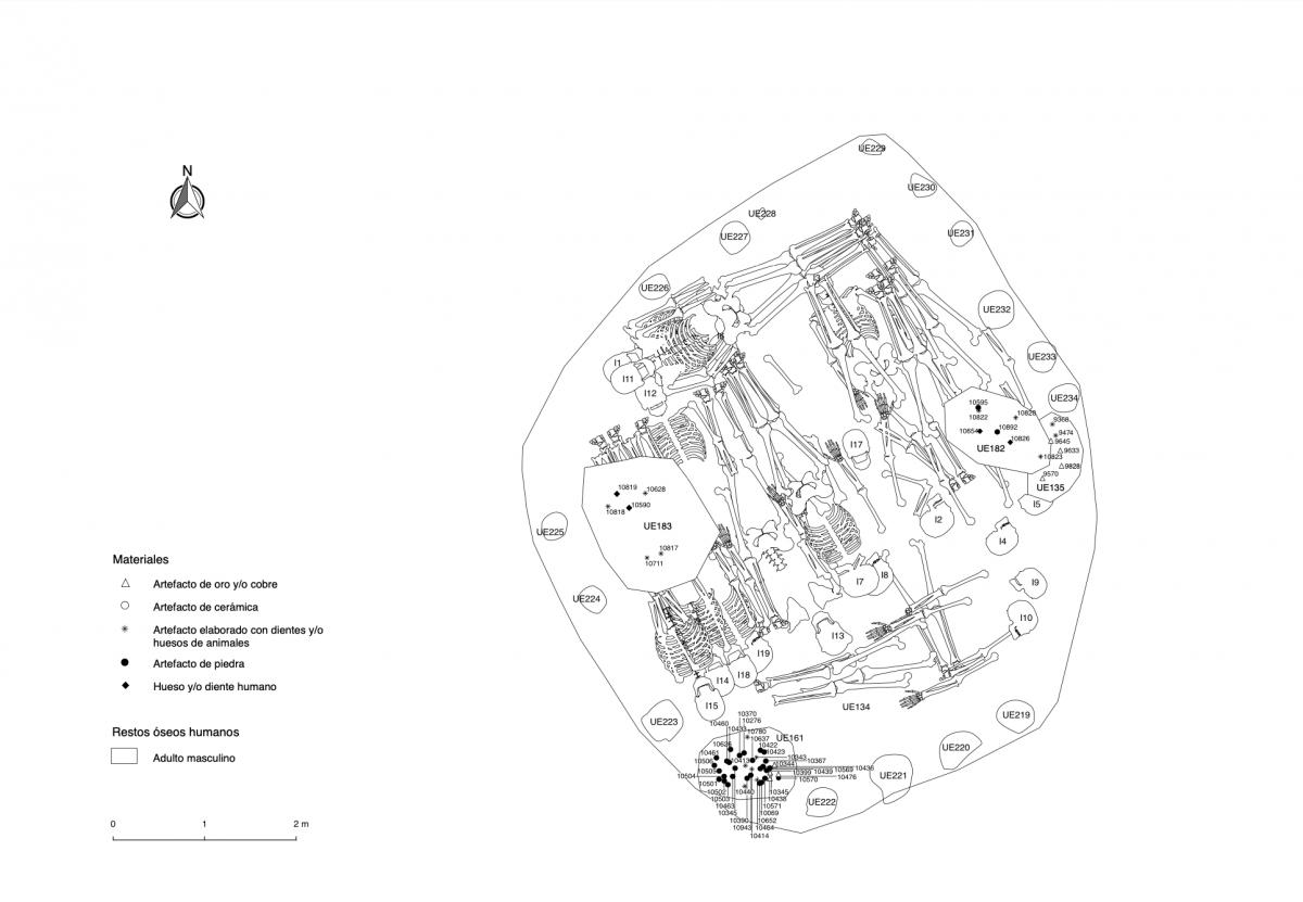 Información del recurso:  Entierro principal de la tumba T2. Fue hallado a 4.2 m de la superficie y en él se encontraron los restos articulados de diecinueve individuos varones de entre 16 y 50 años de edad. Todos fueron colocados en decúbito ventral extendido con los brazos dispuestos a ambos lados del cuerpo, menos el individuo de más alto estatus (código -I7-), el cual fue enterrado con los brazos flexionados sobre el pecho.